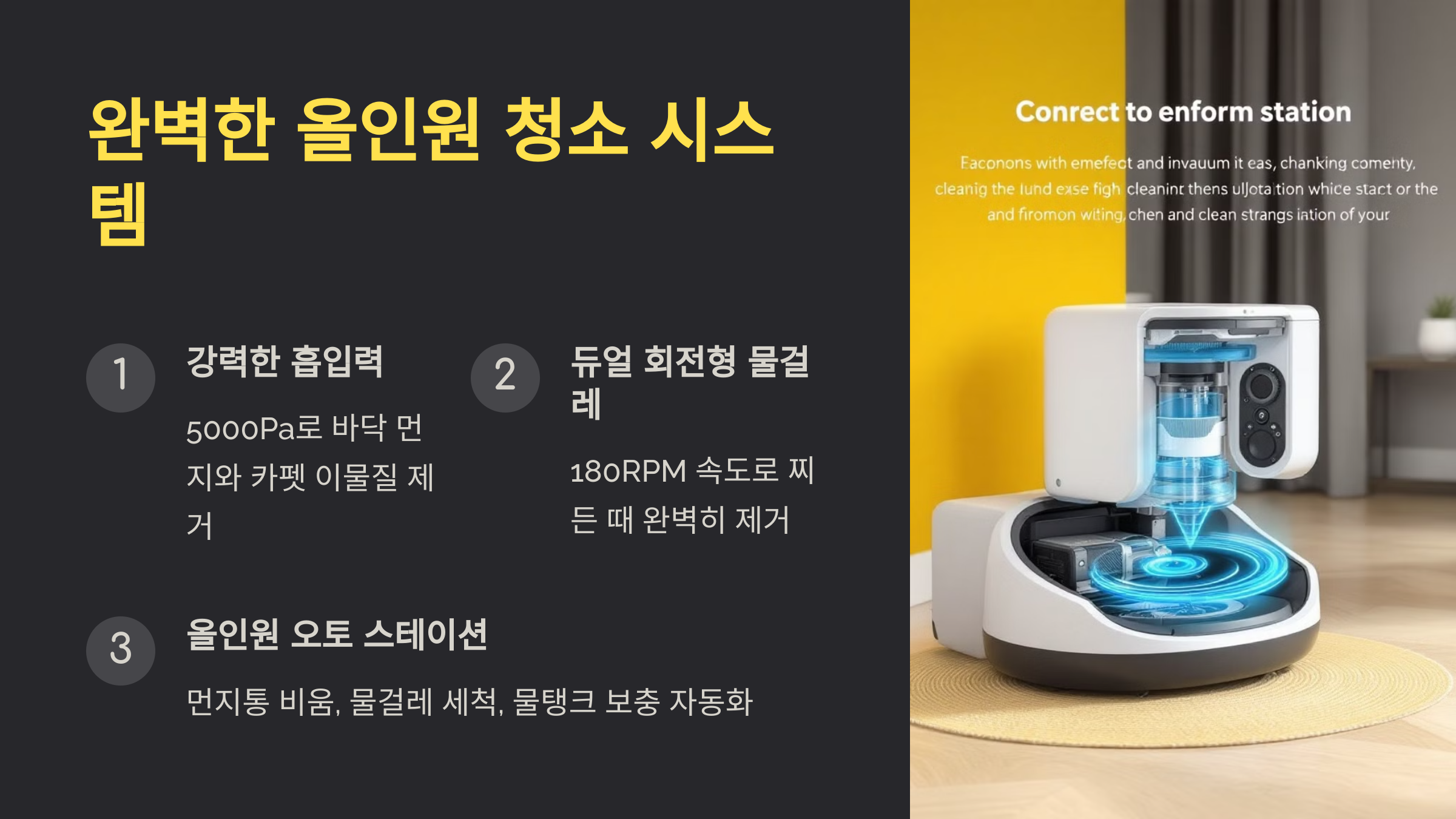- 듀얼 회전형 물걸레: 물걸레가 180RPM 속도로 회전하며 바닥의 찌든 때를 완벽히 닦아냅니다.