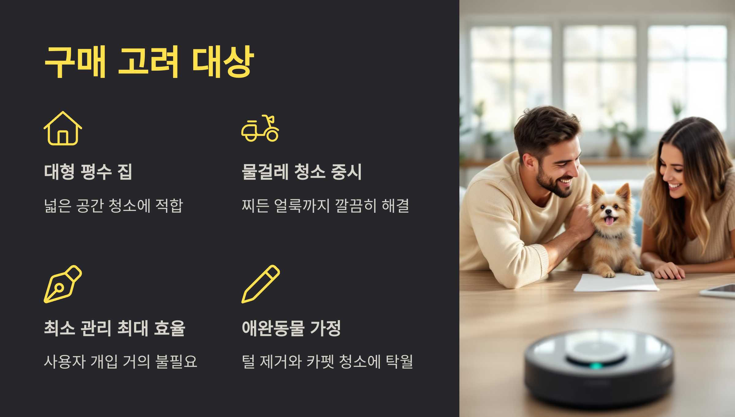 - 물걸레 청소를 중시하는 가정: 듀얼 회전형 물걸레가 찌든 얼룩까지 깔끔히 해결.