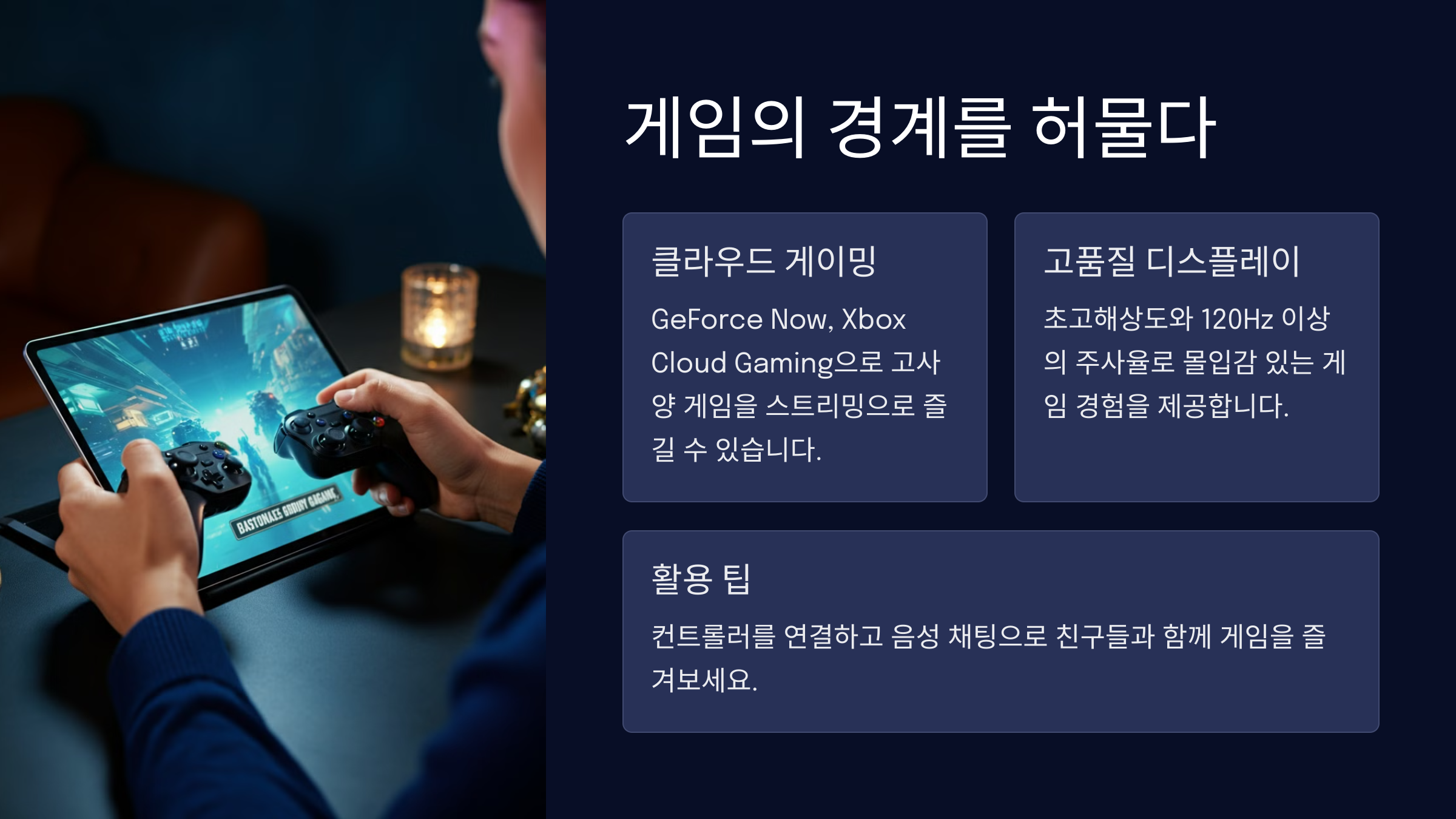 태블릿은 단순한 모바일 게임용 기기를 넘어 클라우드 게이밍의 중심이 되고 있습니다. 이제는 PC나 콘솔이 없어도 고사양 게임을 태블릿으로 즐길 수 있습니다.