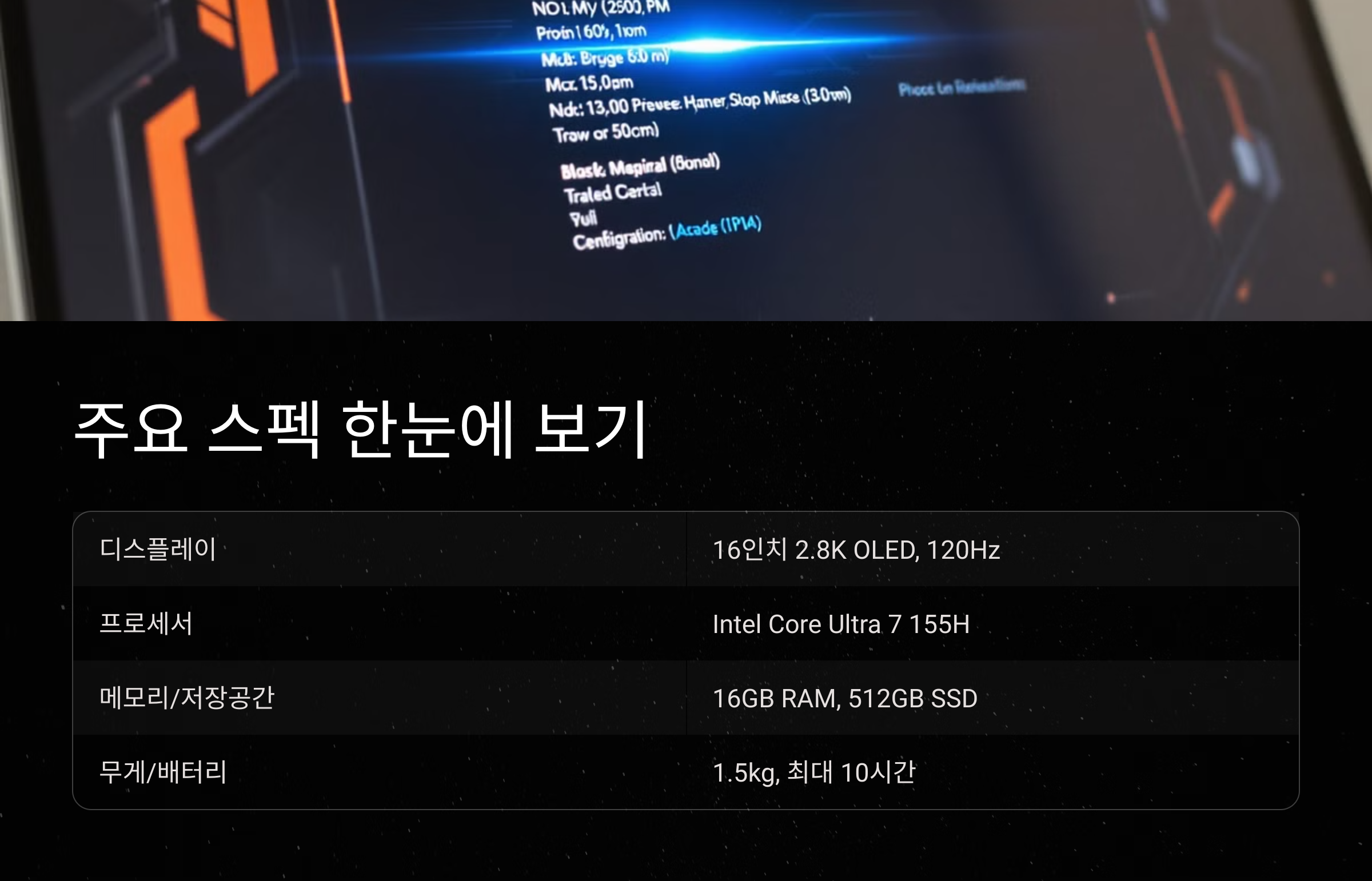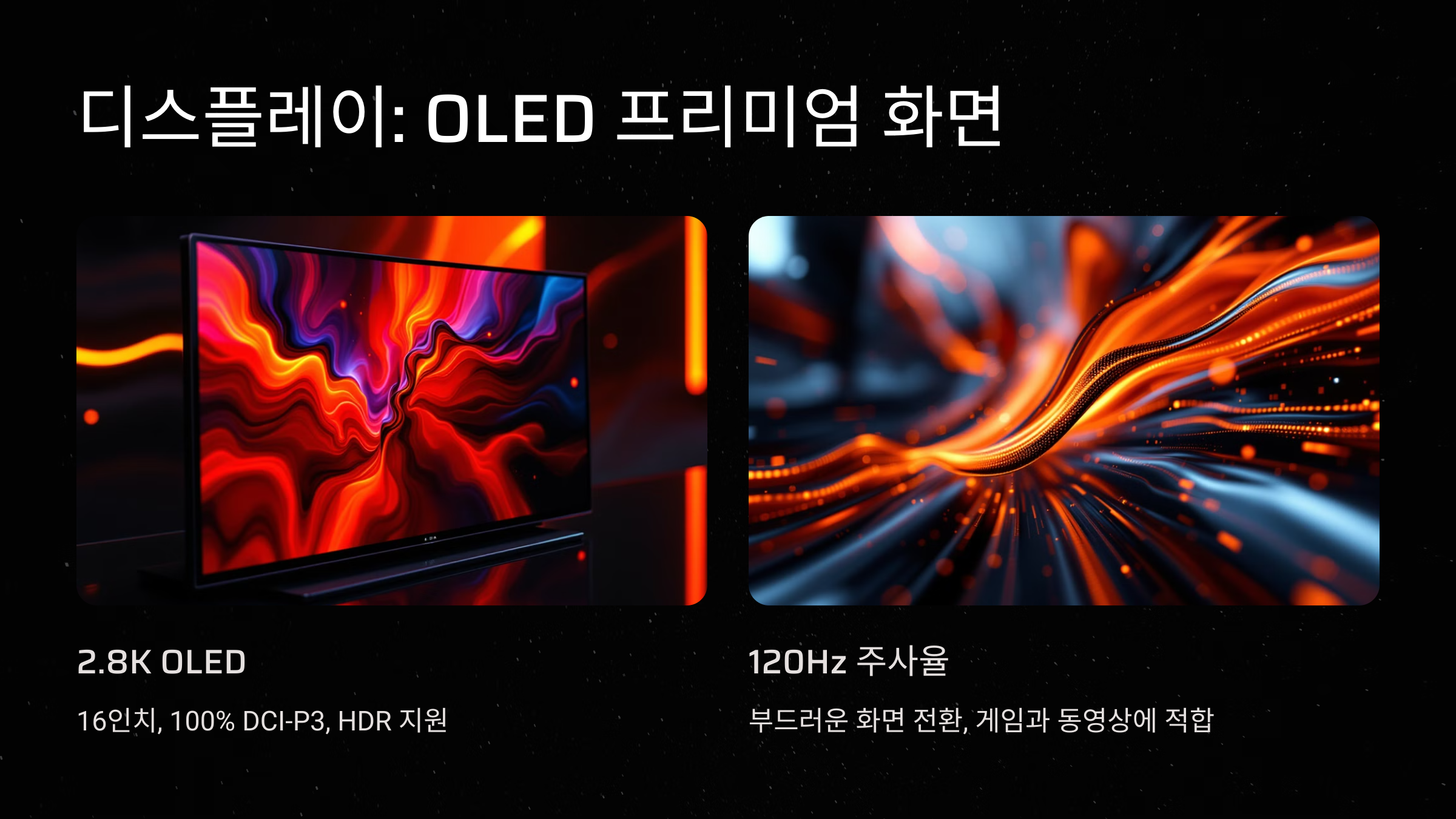 - 디스플레이: 16인치 2.8K OLED (2880x1800 해상도, 120Hz, 100% DCI-P3)