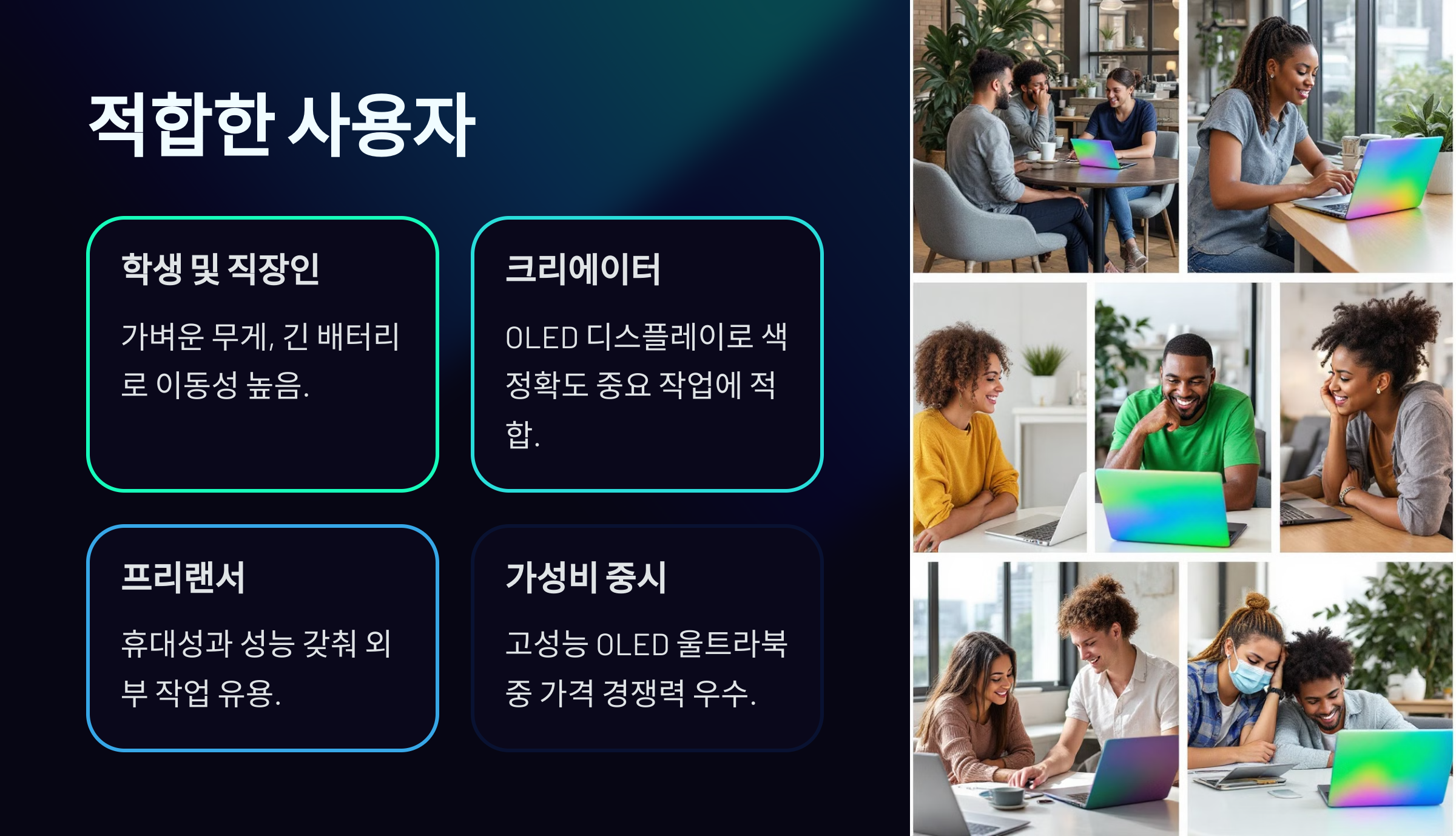 - OLED 디스플레이로 사진 편집, 영상 편집 등 색 정확도가 중요한 작업에 적합.