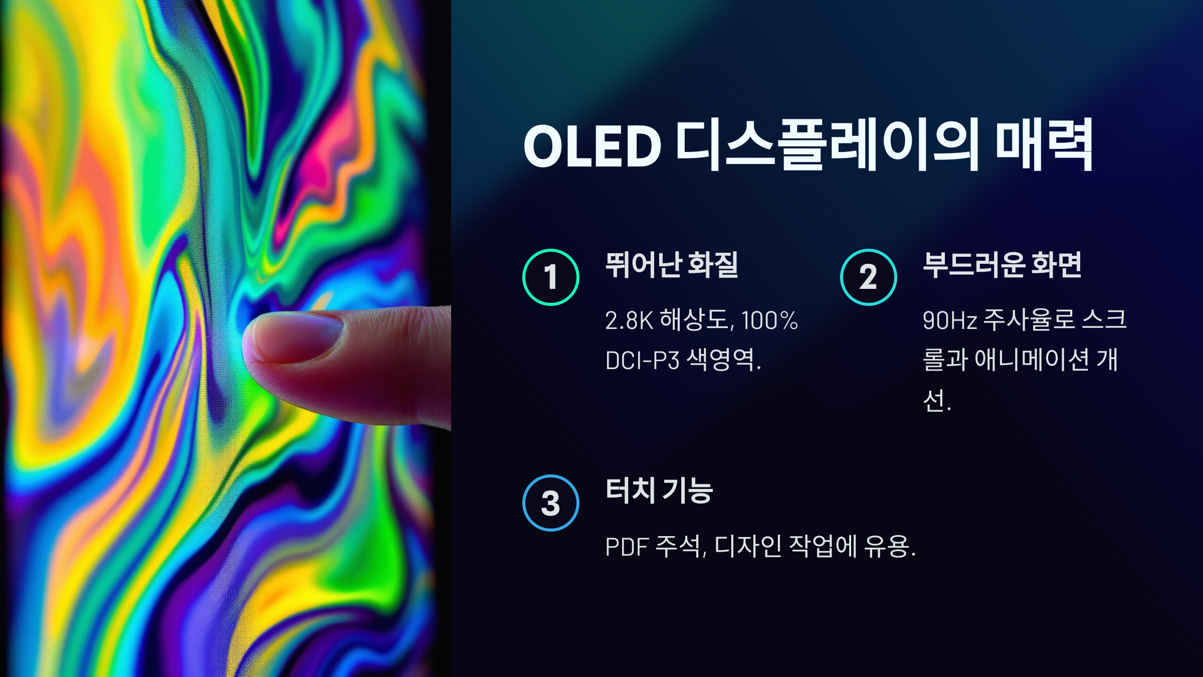 "OLED 디스플레이는 정말 최고예요. 사진 편집할 때 색감이 정확해서 작업 효율이 올라갔습니다."