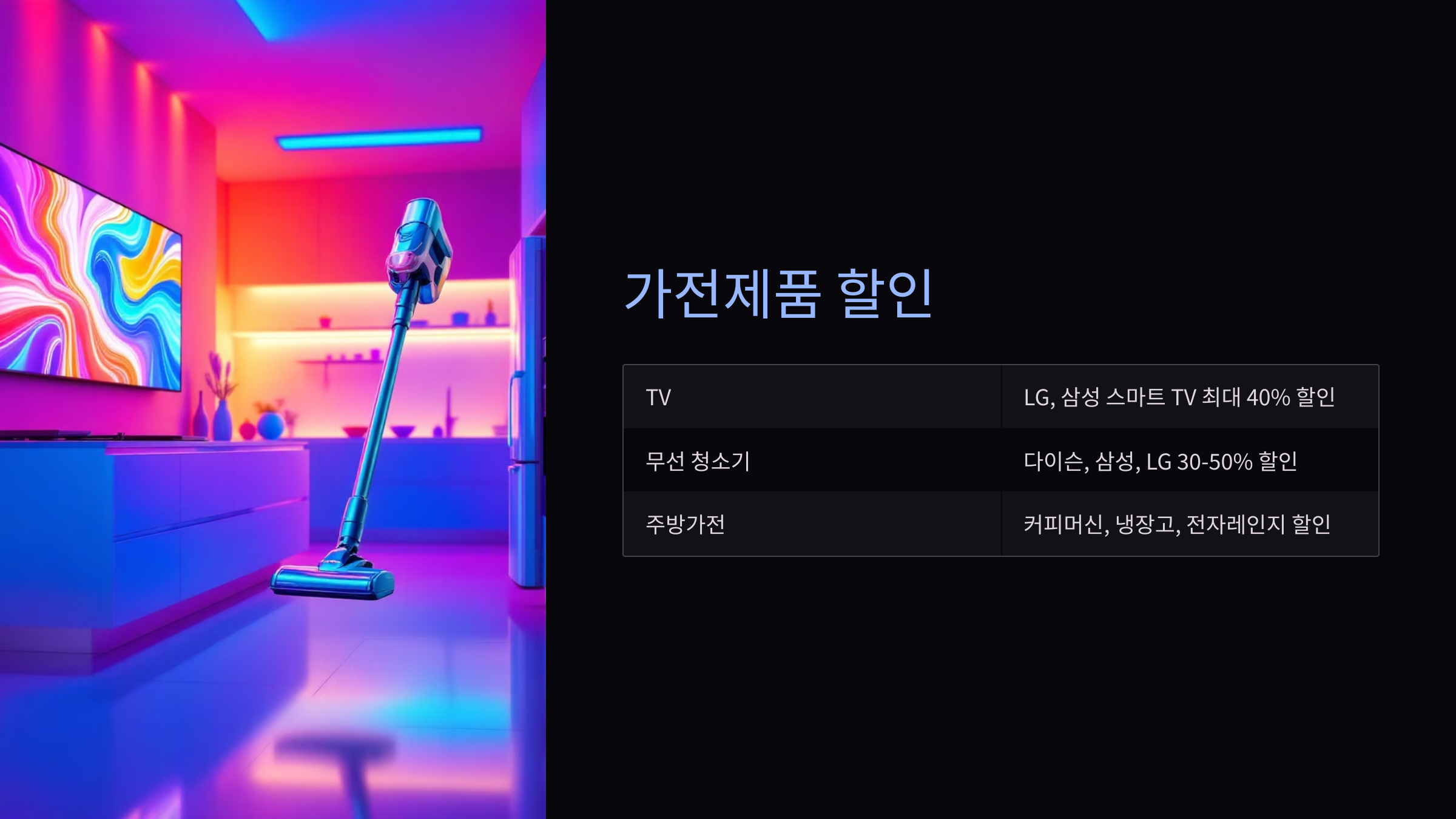 - 무선 청소기: 다이슨, 삼성, LG 청소기 등은 평균 30-50% 할인된 가격에 판매됩니다. 집안 청소를 편리하게 만들어줄 최신 무선 청소기를 이번 기회에 장만해 보세요.