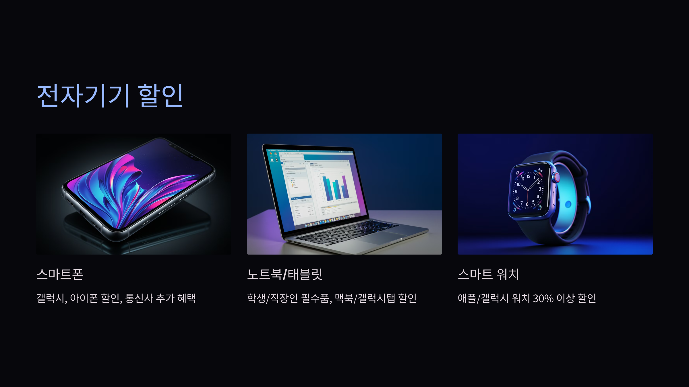 - 스마트 워치: 애플 워치, 갤럭시 워치 등 웨어러블 기기 역시 할인됩니다. 활동량을 기록해주는 스마트 워치는 최대 30% 이상 할인되며, 운동을 즐기는 소비자에게 인기가 많습니다.