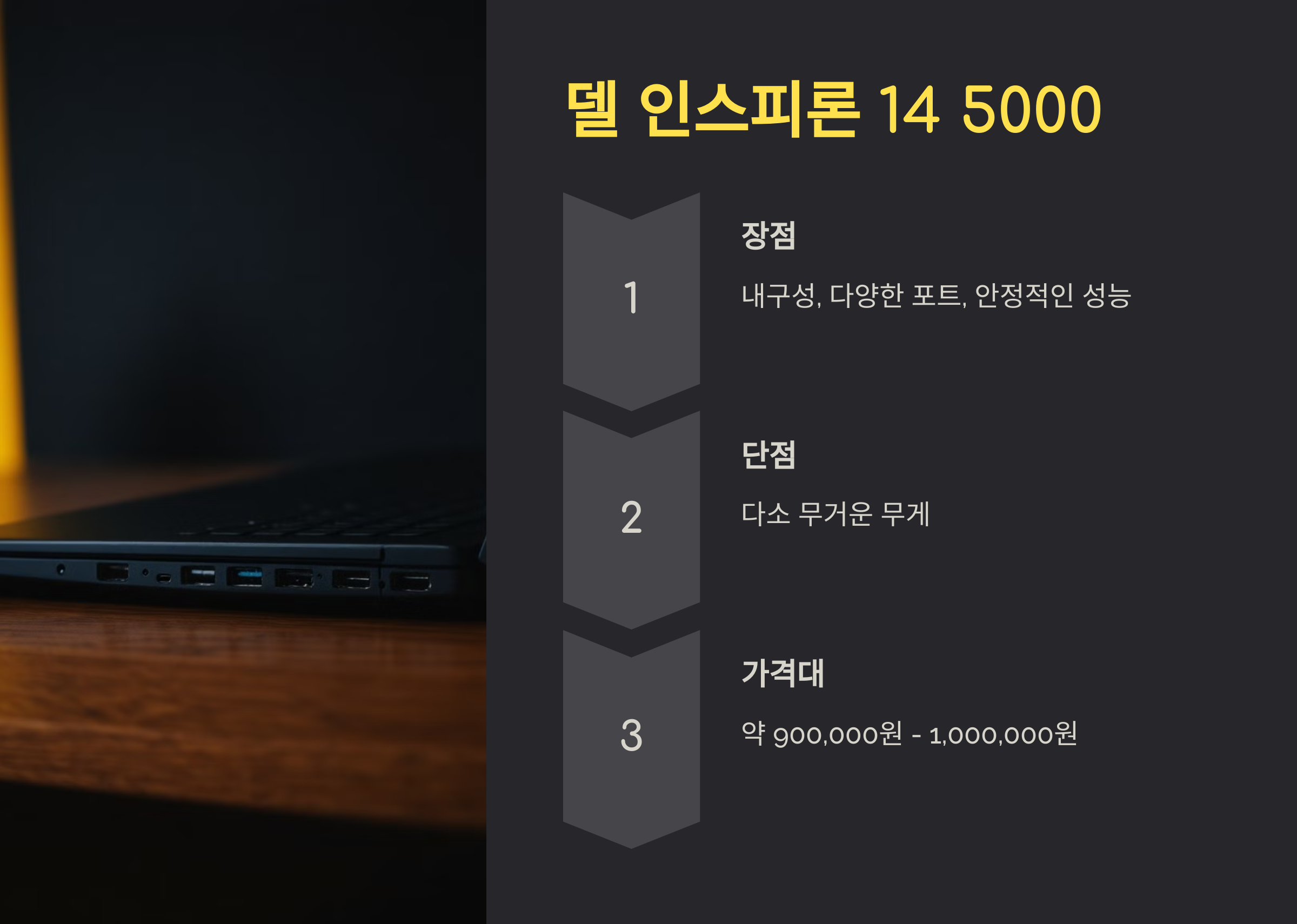 | 델 인스피론 14 5000 | 내구성, 다양한 포트 | 무거운 무게 | 900,000원 - 1,000,000원 |