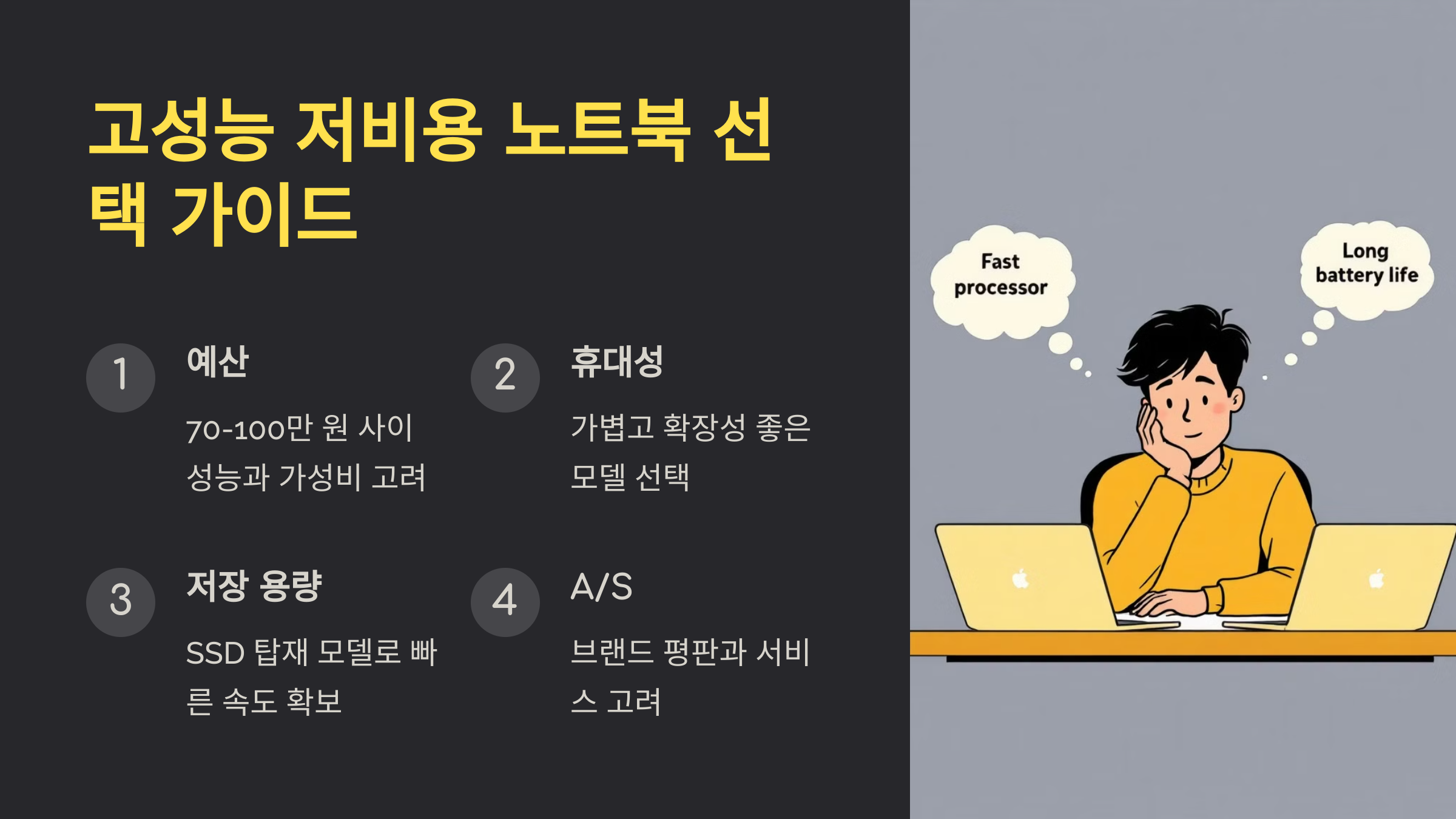 - A/S 및 브랜드 평판: 장기적으로 사용할 노트북이므로, A/S 서비스가 좋은 브랜드를 선택하면 안심하고 사용할 수 있습니다.