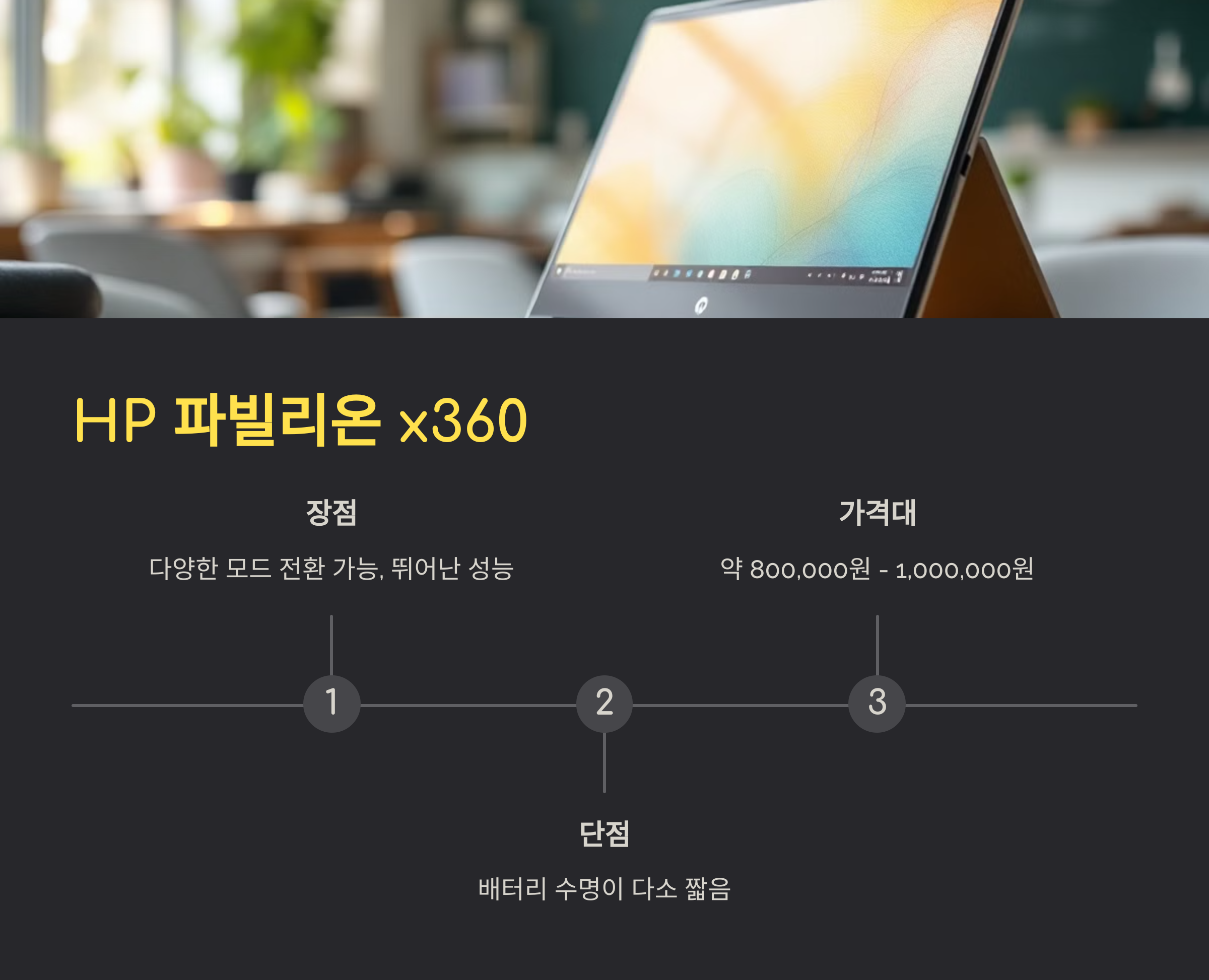 | HP 파빌리온 x360 | 다양한 모드 전환 가능 | 배터리 수명 아쉬움 | 800,000원 - 1,000,000원 |