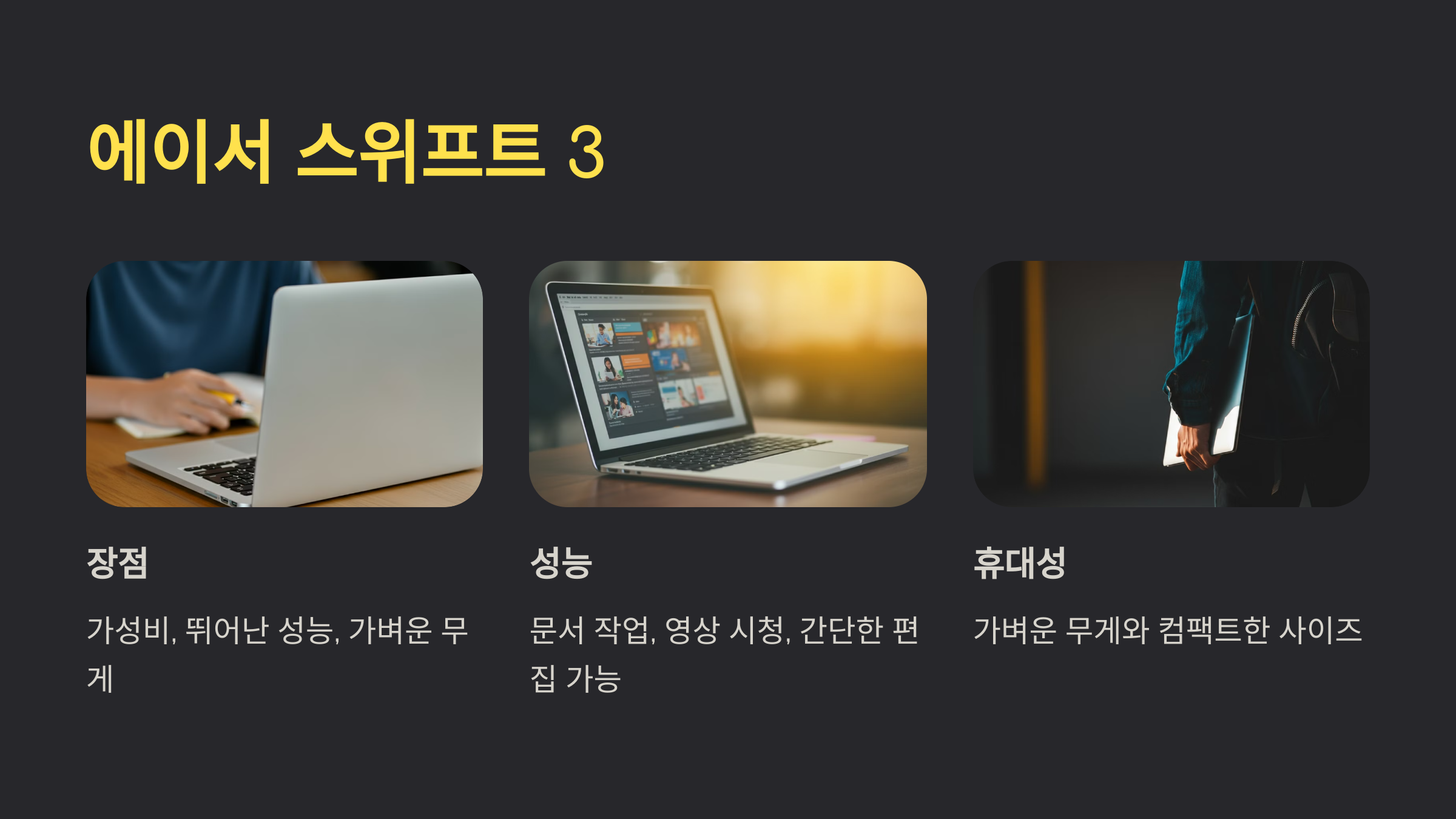 - 장점: 슬림한 디자인, 고성능, 긴 배터리 수명