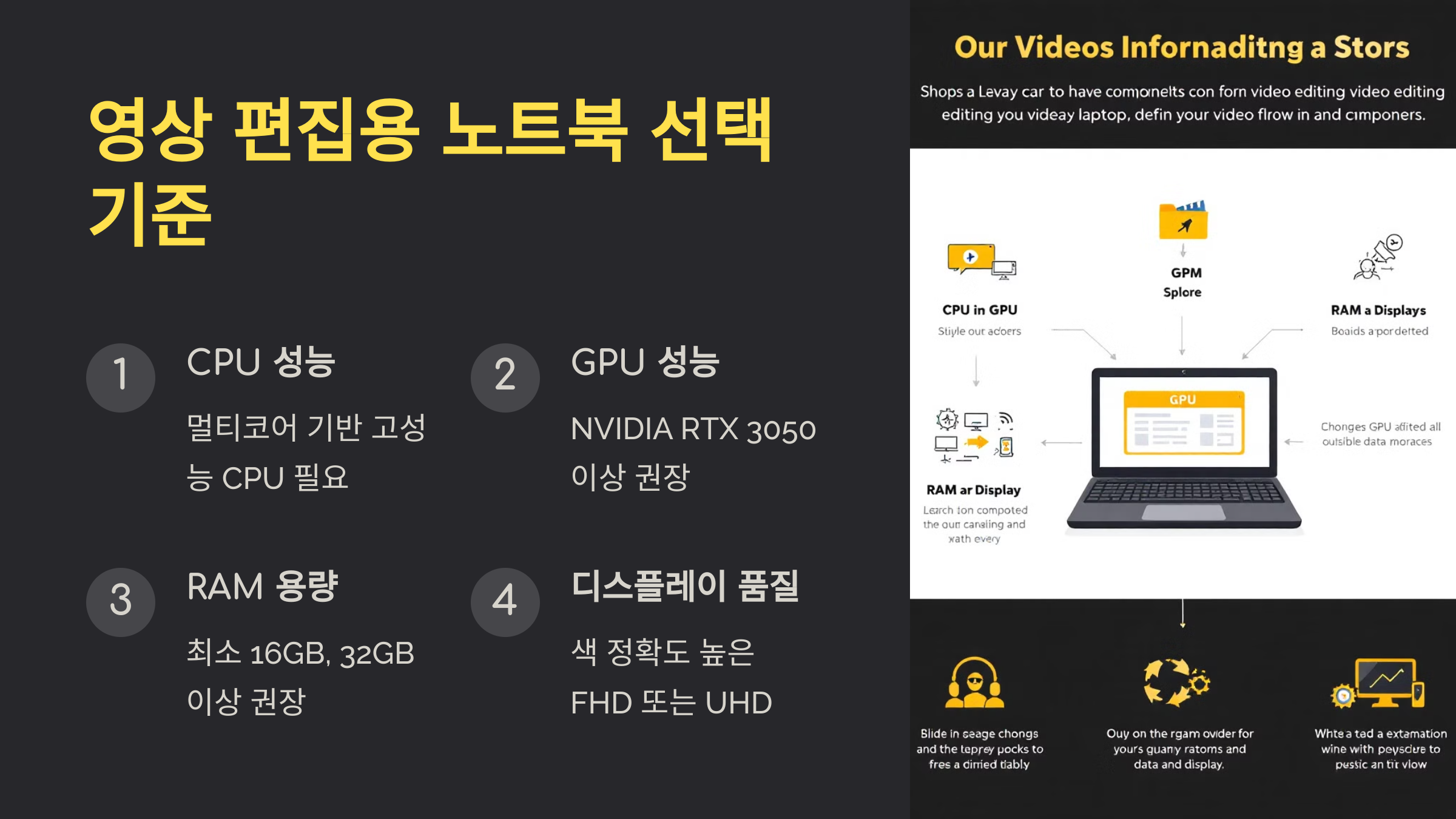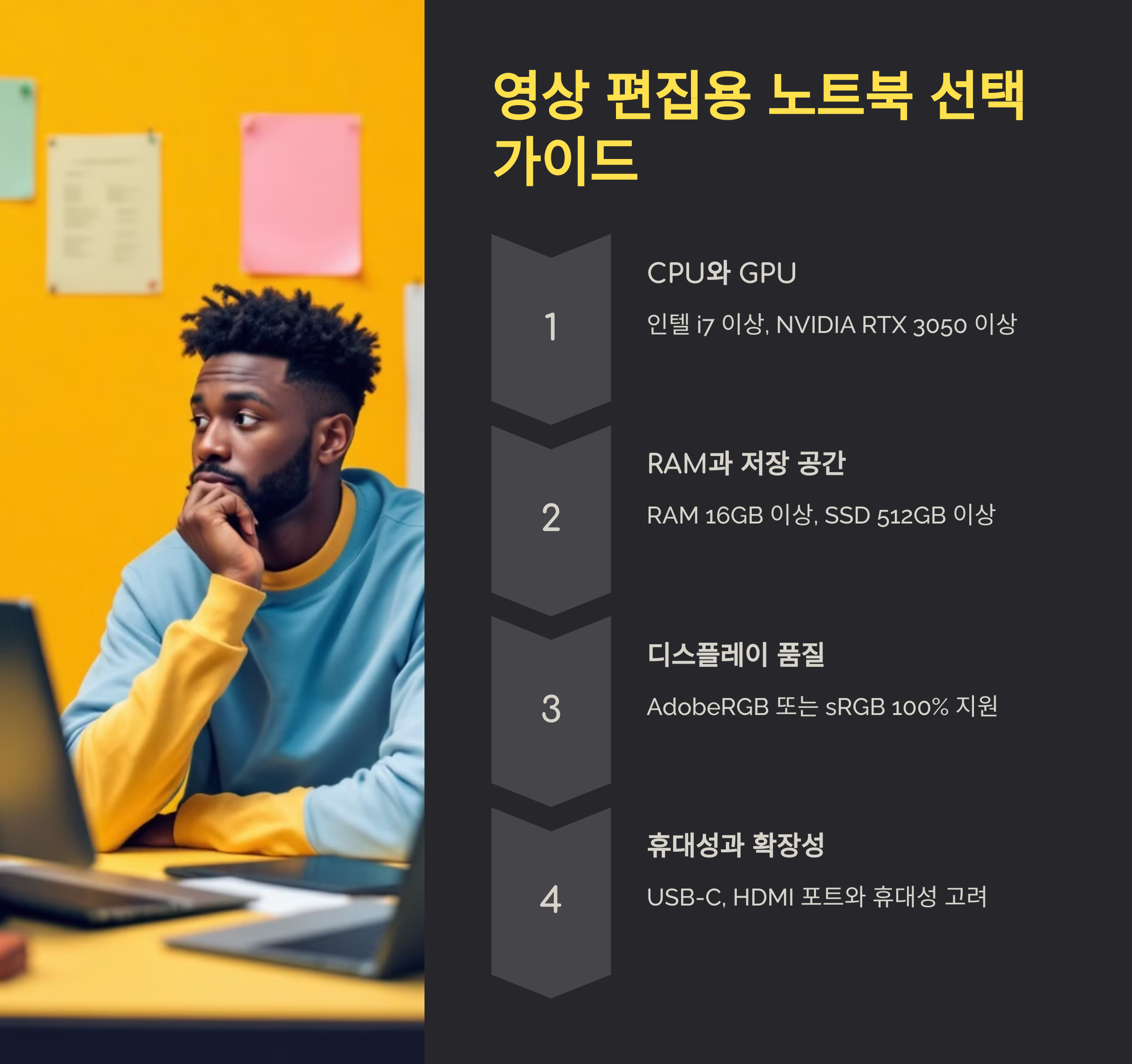영상 편집 작업은 다른 작업과 비교해 훨씬 높은 사양을 요구합니다. 다음은 영상 편집용 노트북을 선택할 때 반드시 확인해야 할 요소들입니다.