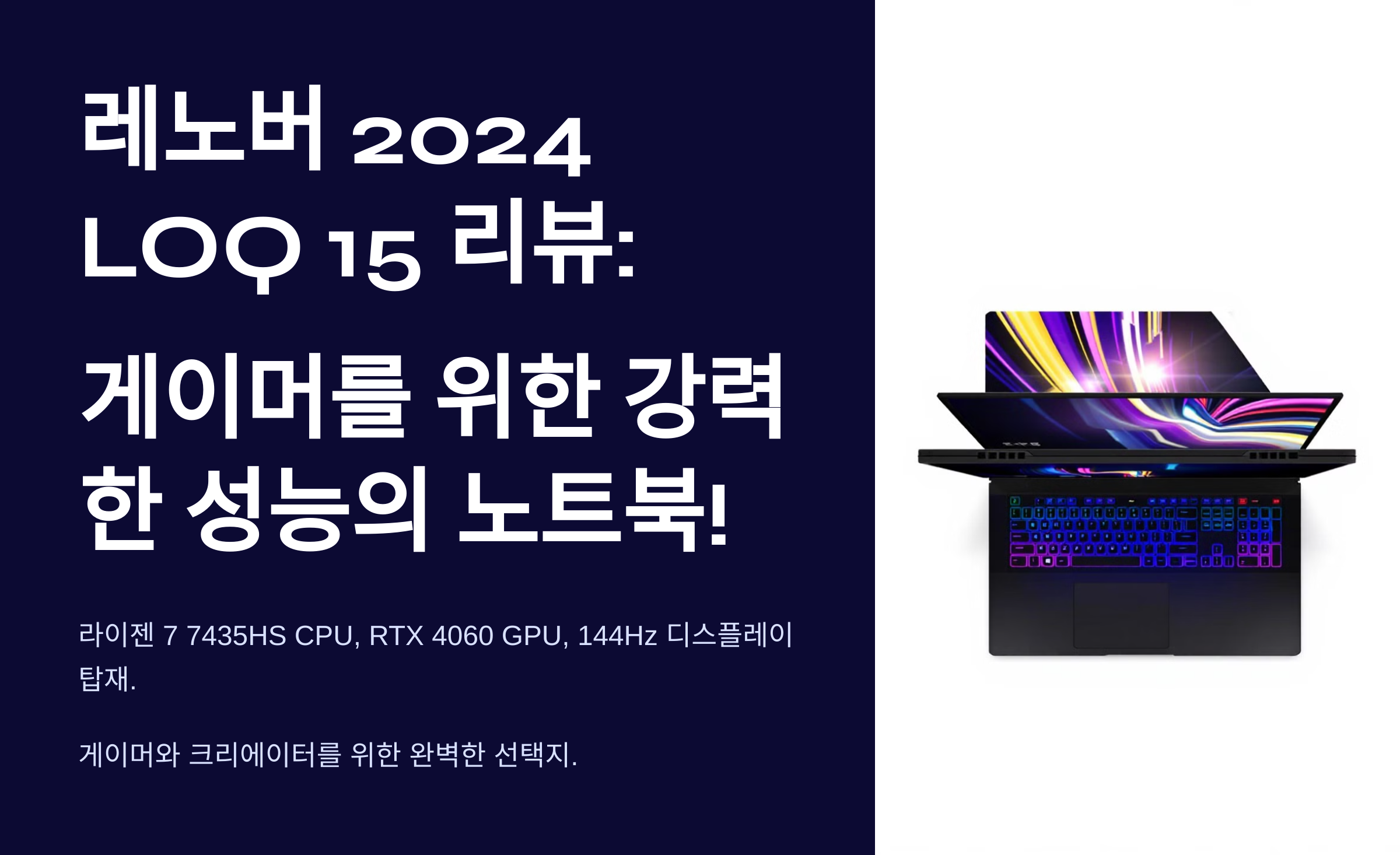 레노버 2024 LOQ 15는 라이젠 7 7435HS, RTX 4060, 144Hz 디스플레이라는 강력한 스펙을 갖추고도 가성비를 유지한 게이밍 노트북입니다. 게임은 물론 크리에이티브 작업에서도 뛰어난 성능을 발휘하며, 게이머와 크리에이터 모두에게 이상적인 선택이 될 것입니다. 💻 성능과 가격의 완벽한 조화를 찾고 있다면, 이 제품을 강력히 추천합니다! 😊