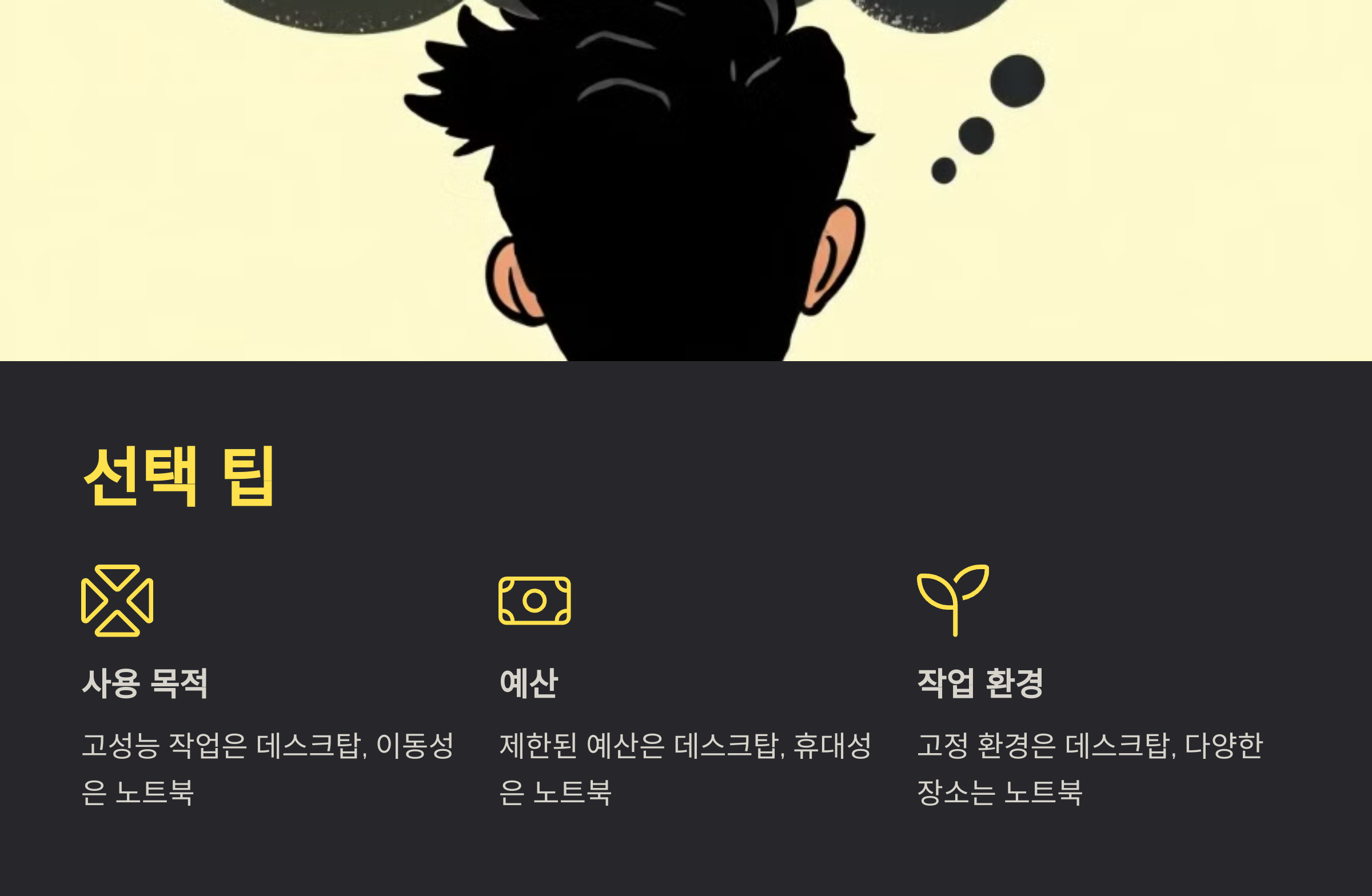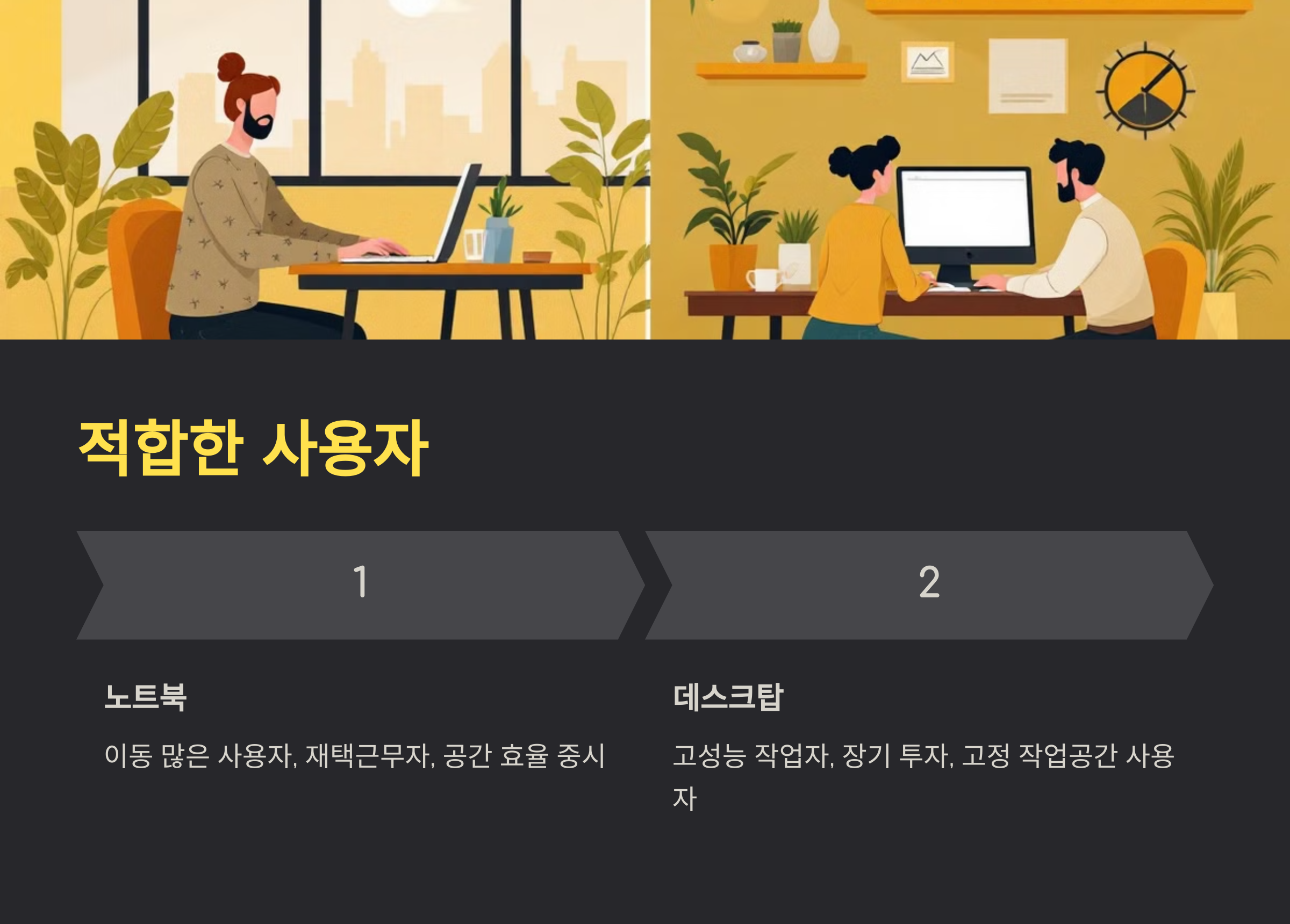 - 💻 노트북을 선택하세요: 이동 중 작업이 많거나 간단한 작업 위주의 사용자.