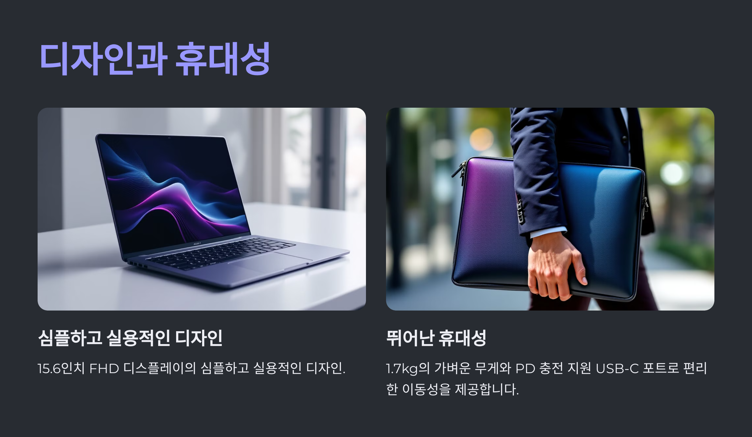 - 약 1.7kg의 무게로 15.6인치 노트북 중에서도 가벼운 편에 속하며, 이동 중에도 부담 없이 사용할 수 있습니다.
