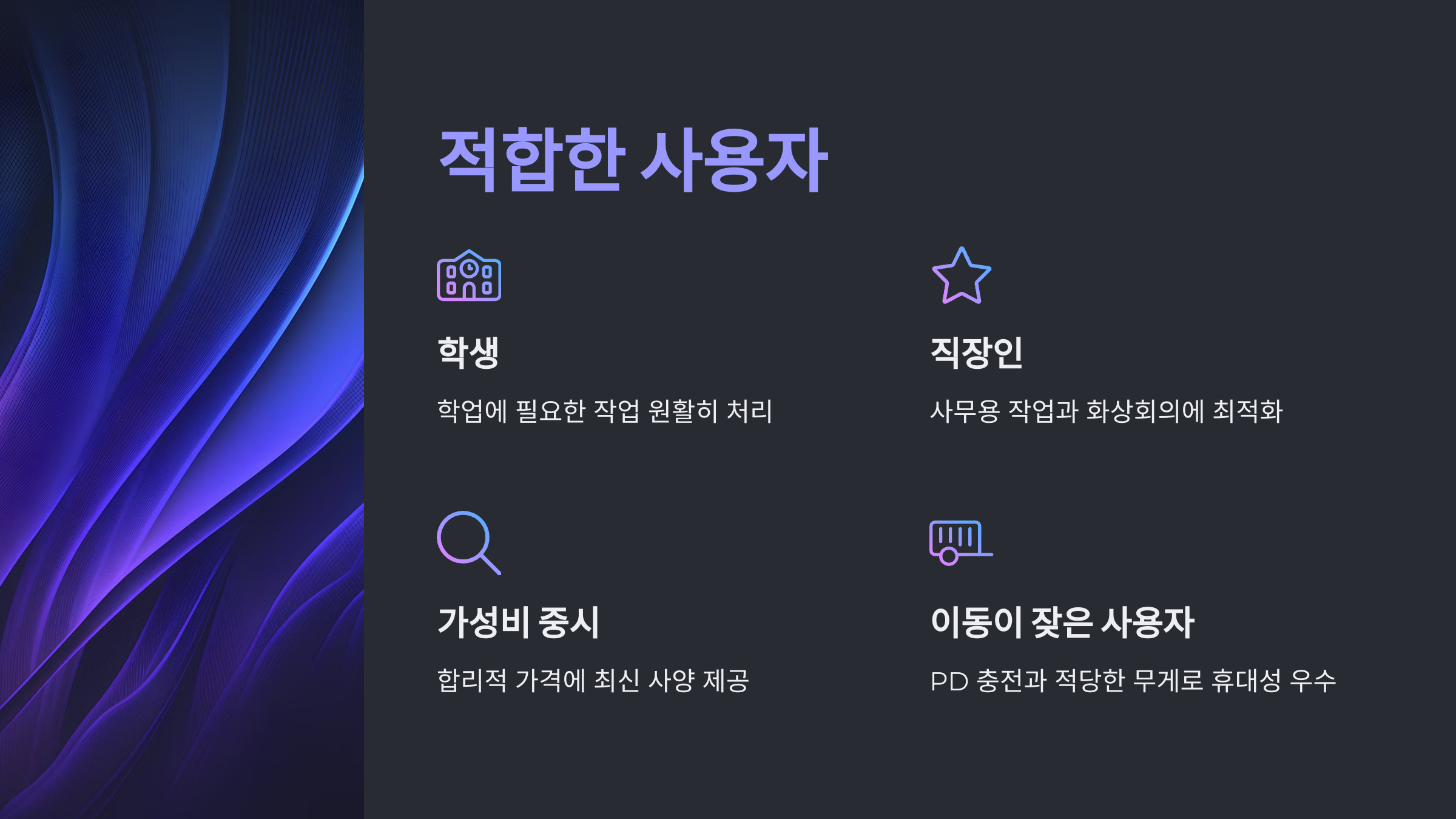 - 합리적인 가격에 최신 사양의 노트북을 원하는 사용자에게 추천.
