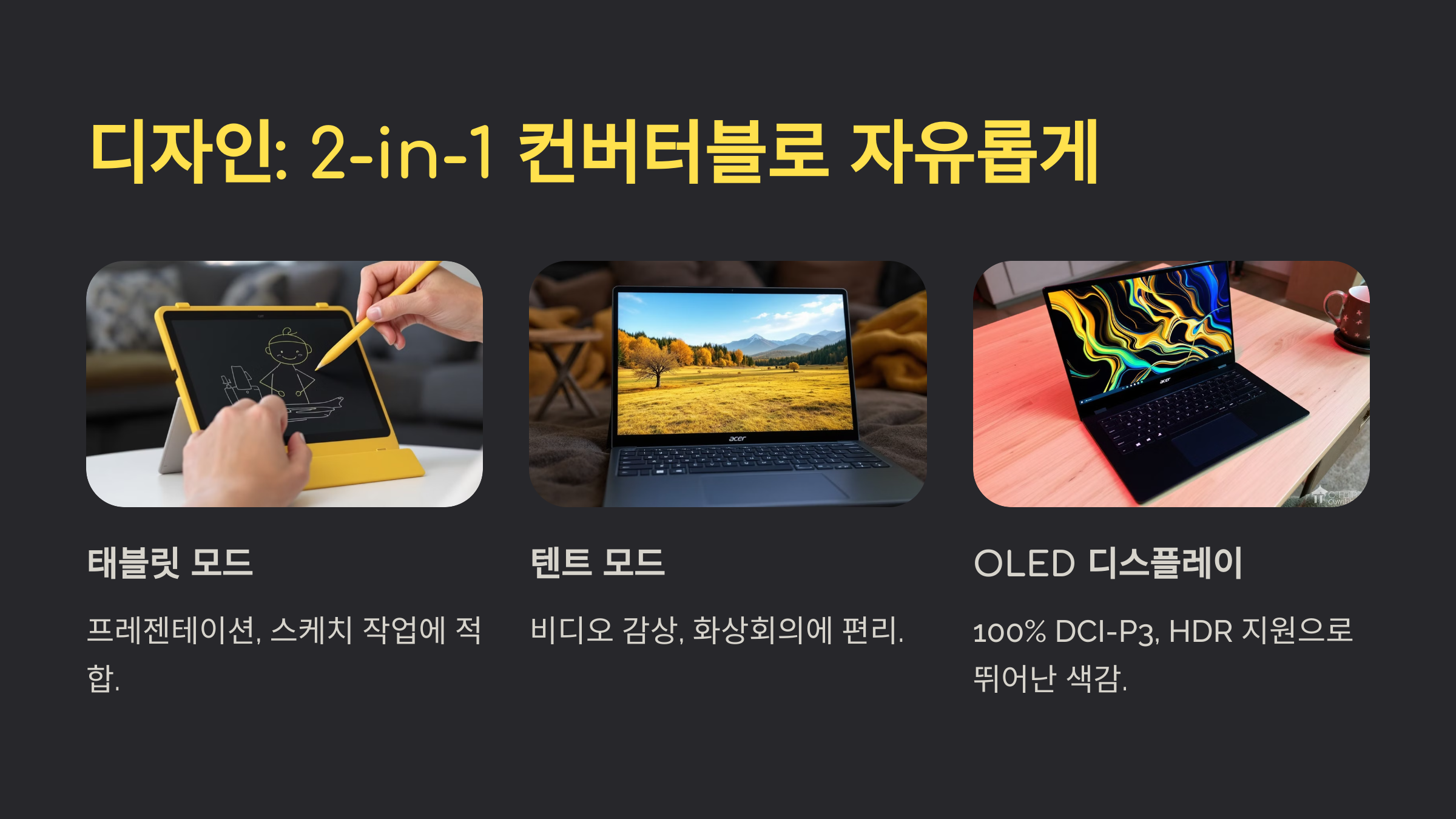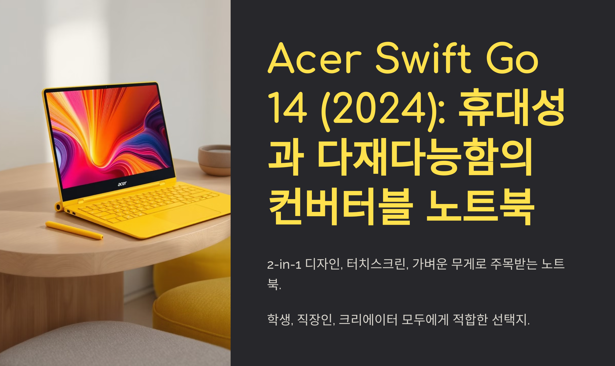 Acer Swift Go 14 (2024)는 2-in-1 컨버터블 디자인, OLED 디스플레이, 뛰어난 휴대성으로 모든 사용자에게 매력적인 옵션을 제공합니다. 특히 크리에이터, 학생, 직장인들에게 최적화된 기능과 디자인으로 다양한 작업 스타일을 완벽히 지원합니다. 💼