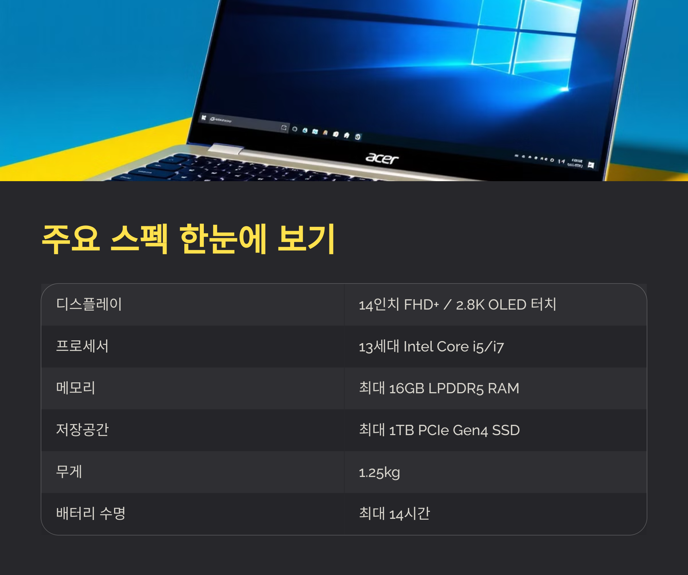 - 디스플레이: 14인치 FHD+ / 2.8K OLED 터치 디스플레이 (2880x1800, 100% DCI-P3)