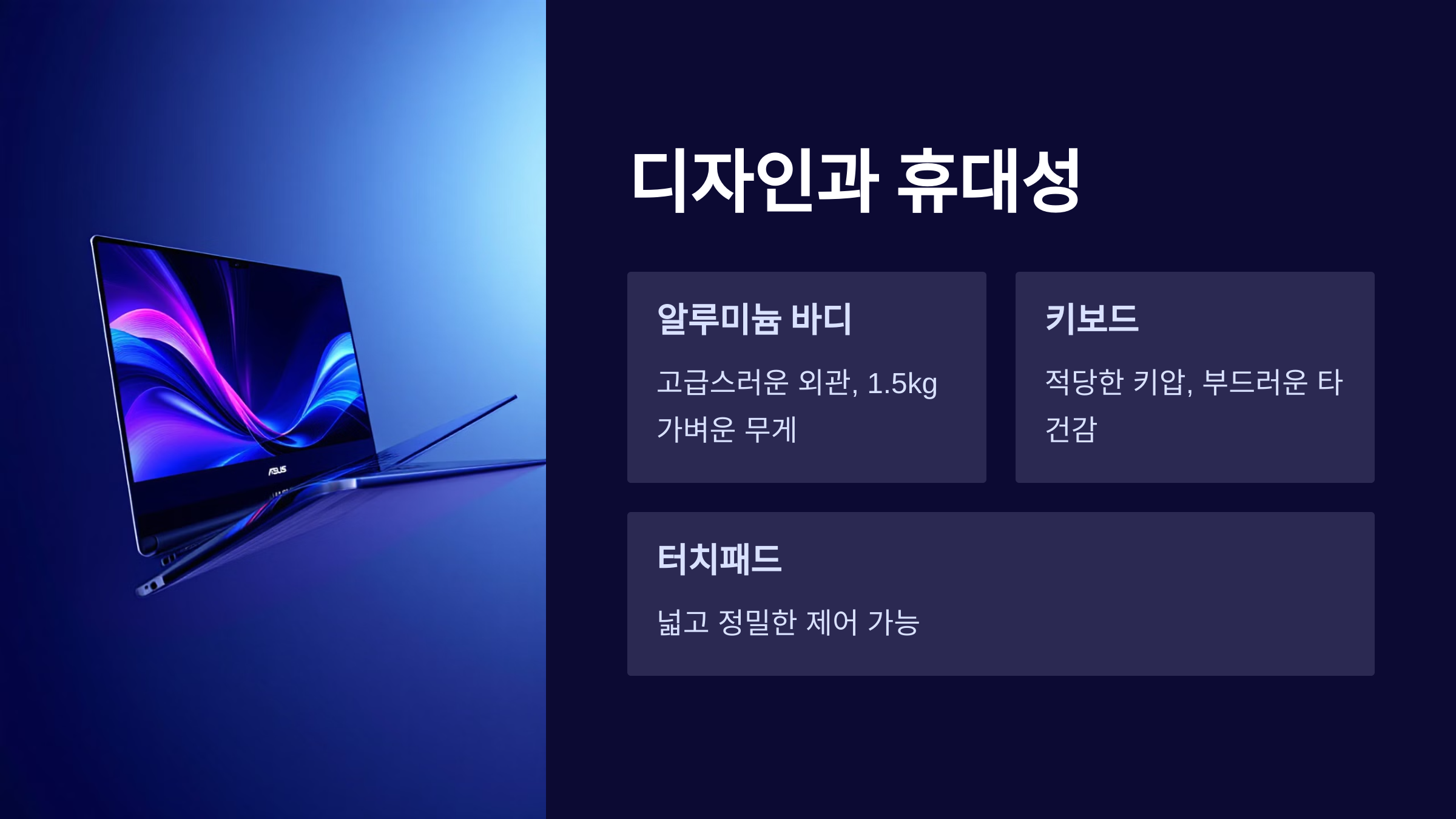 "디자인이 정말 세련됐어요. 어디서든 자신 있게 꺼낼 수 있는 노트북입니다."