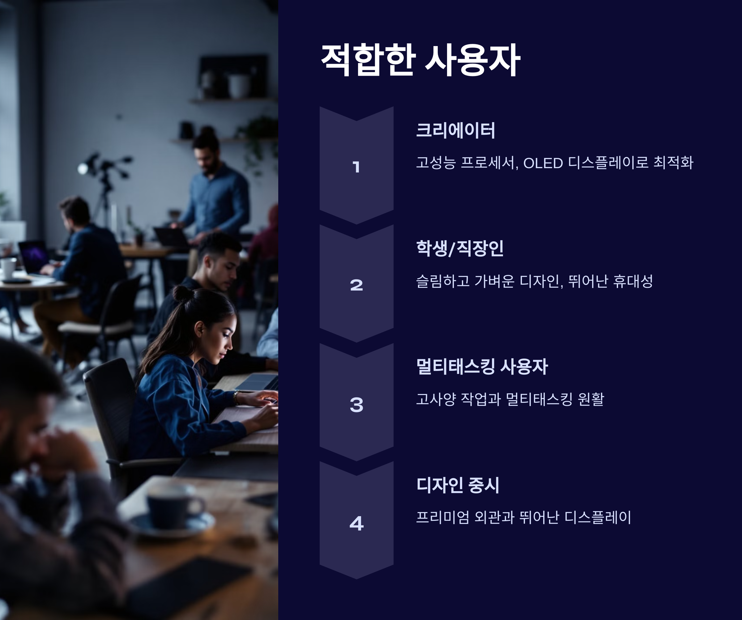 - 고성능 프로세서와 OLED 디스플레이로 사진 편집, 영상 제작, 그래픽 작업에 최적.
