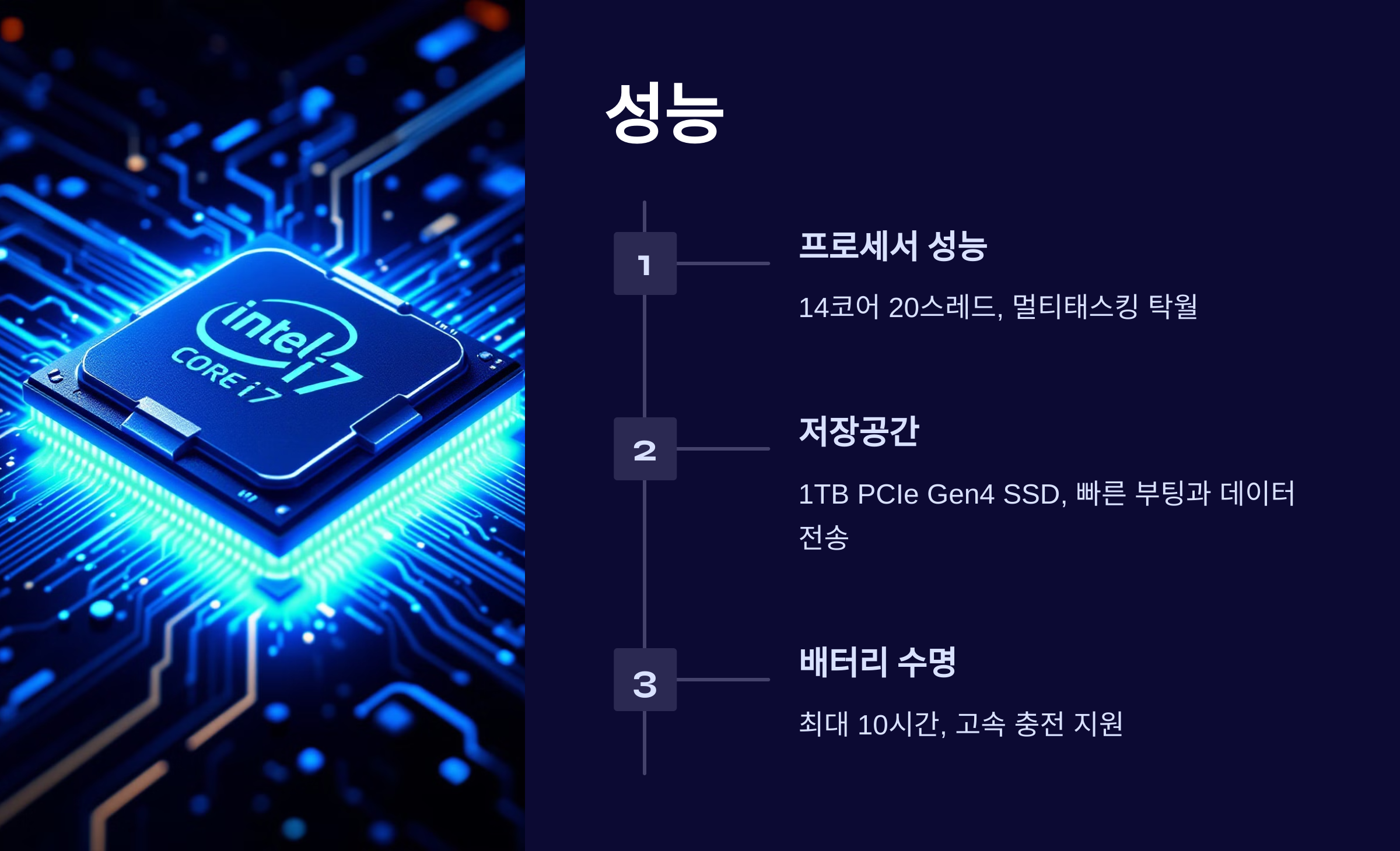 - 가벼운 작업부터 고사양 작업(사진 편집, 4K 영상 렌더링)까지 원활하게 처리 가능.