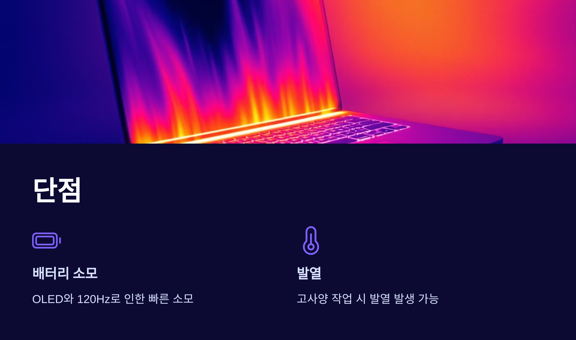 - OLED와 120Hz 주사율의 조합으로 배터리가 FHD 디스플레이 노트북보다 더 빠르게 소모될 수 있음.