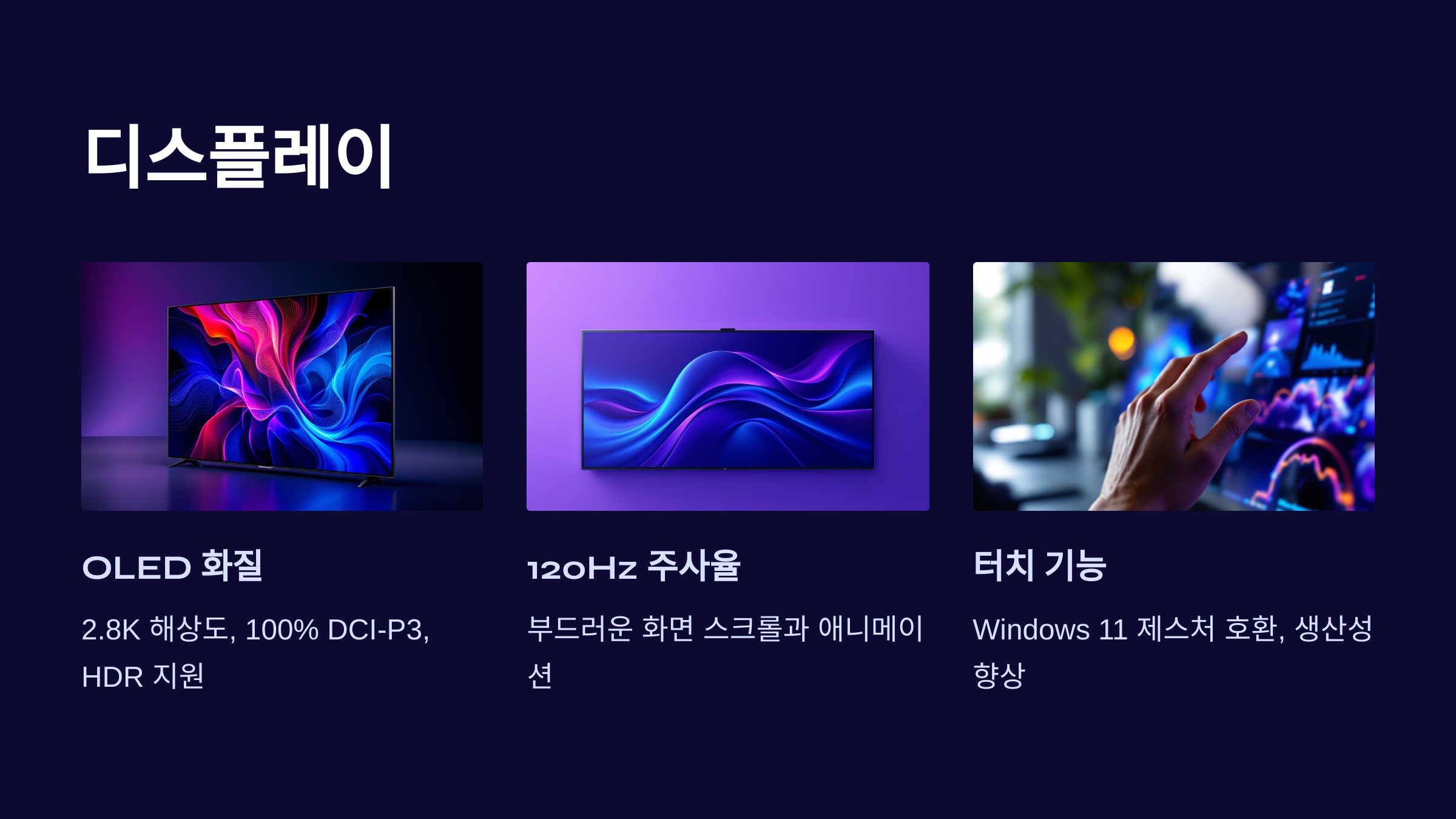 - 디스플레이: 14.5인치 2.8K OLED 터치스크린 (2880x1800, 120Hz, 100% DCI-P3)