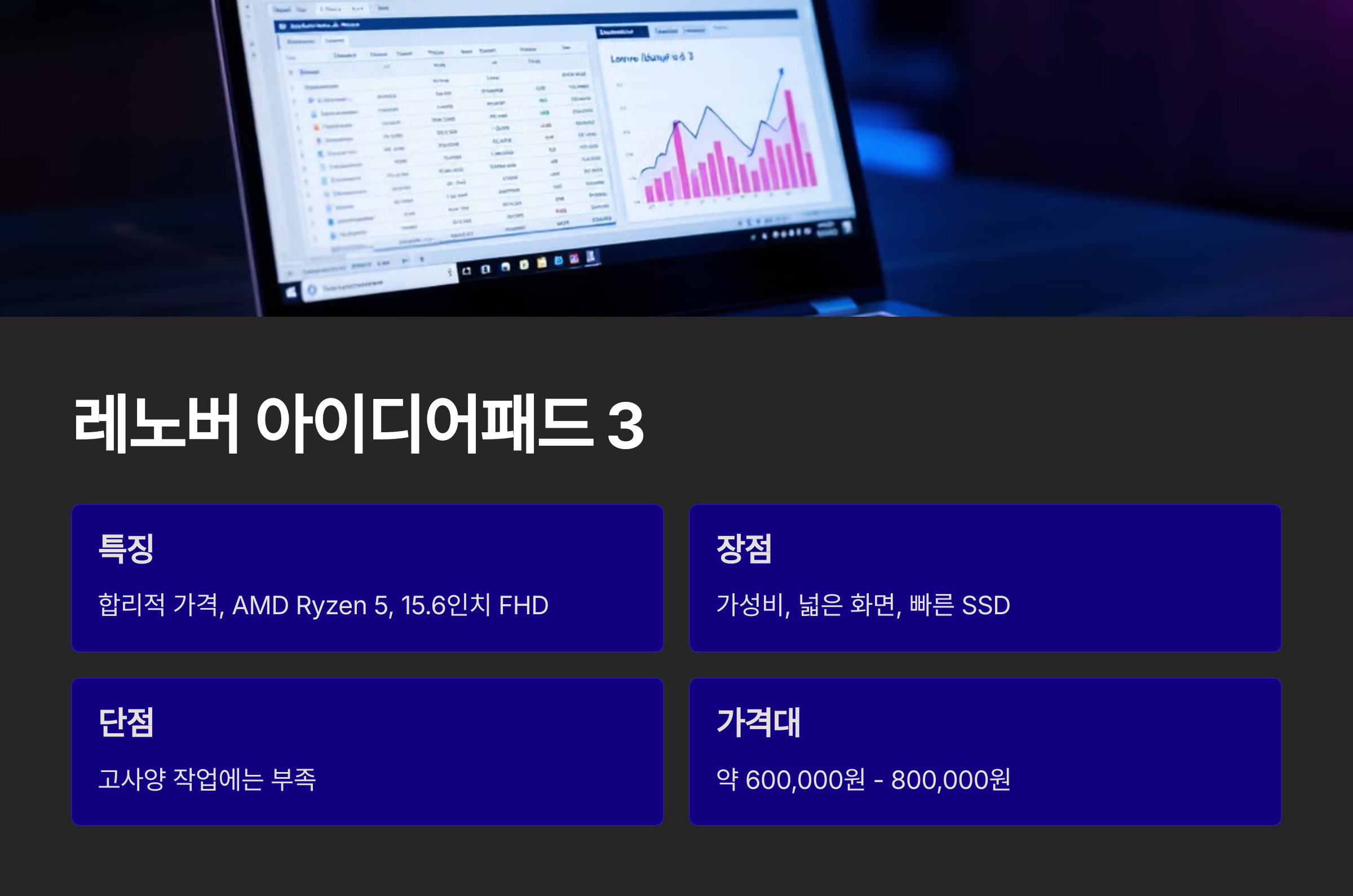 | 레노버 아이디어패드 3 | 가성비, 넓은 화면 | 고사양 작업에는 부족 | 600,000원 - 800,000원 |