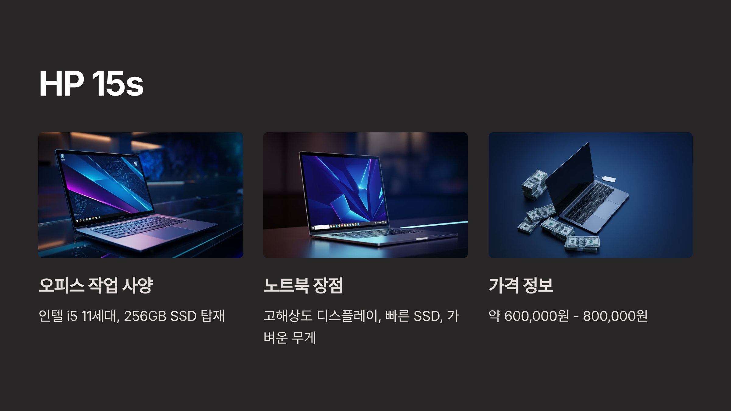 | HP 15s | 고해상도 디스플레이, 경량 | 내구성 아쉬움 | 600,000원 - 800,000원 |