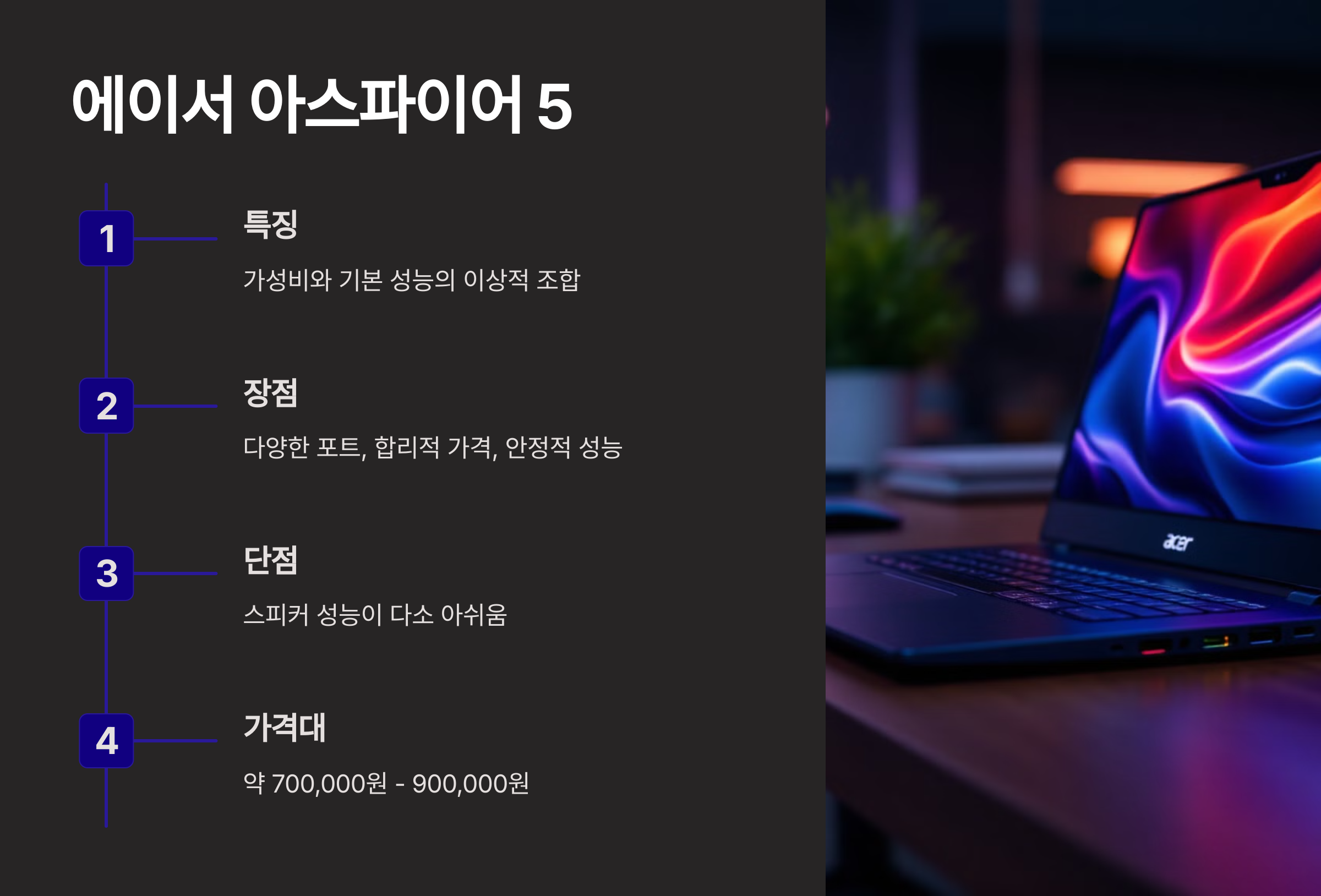| 에이서 아스파이어 5 | 다양한 포트, 안정적인 성능 | 스피커 성능 아쉬움 | 700,000원 - 900,000원 |