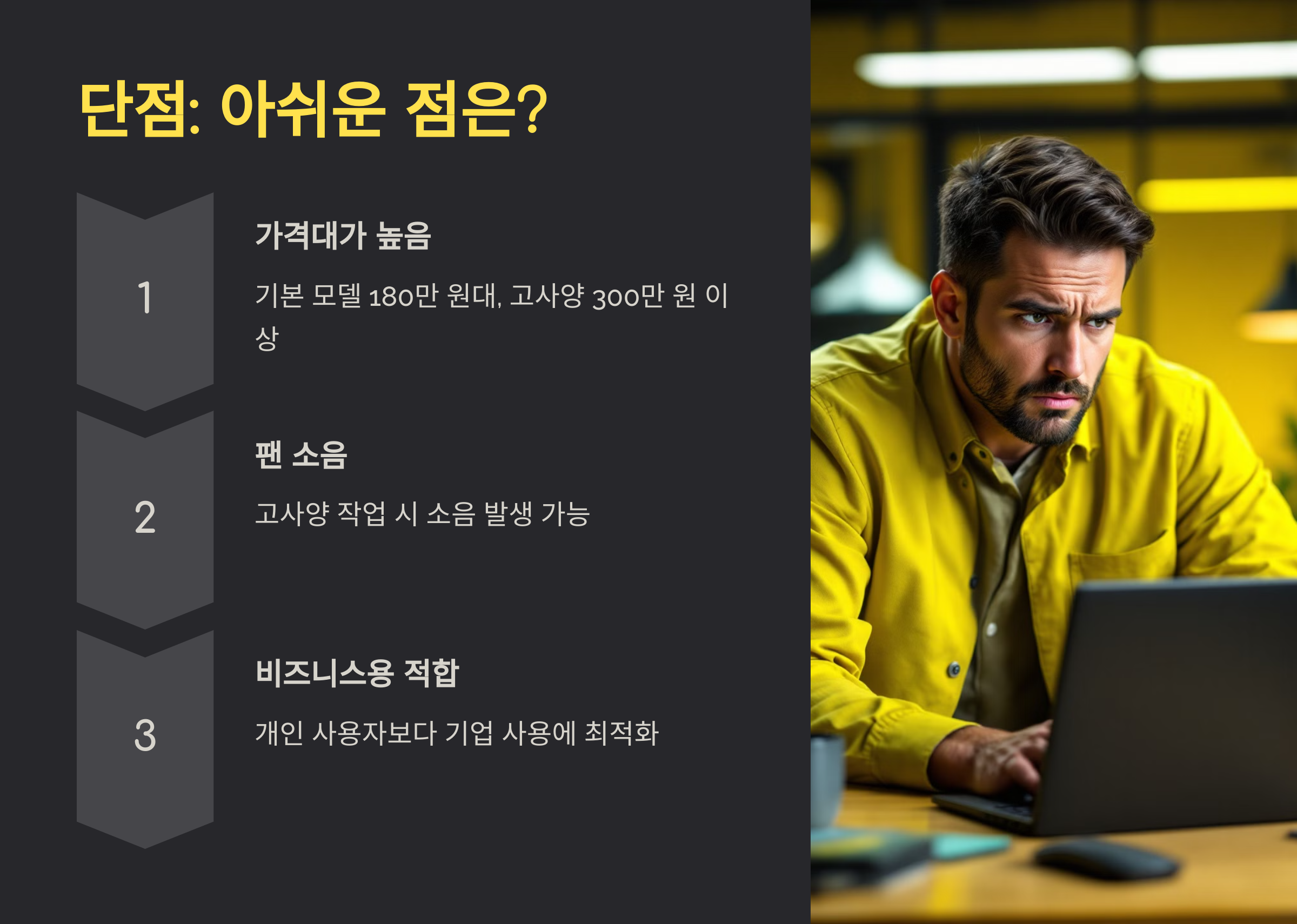 - 고급 기능과 성능 덕분에 일반 사용에도 충분히 만족스러운 경험을 제공합니다. 하지만 높은 가격대는 비즈니스 사용자에게 더 매력적입니다.