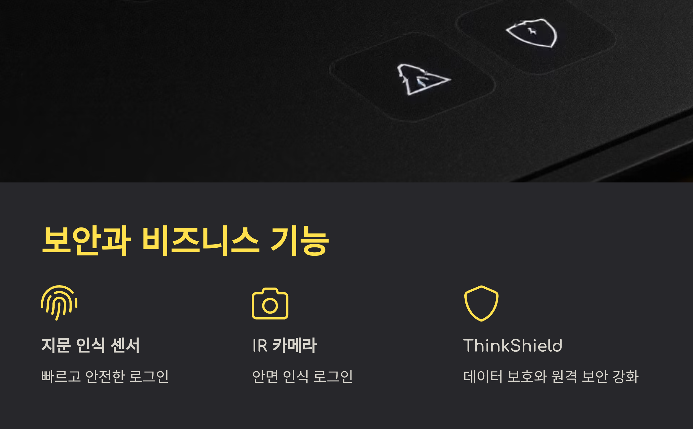 - 보안 기능: 지문 센서, IR 카메라, ThinkShield 보안 솔루션