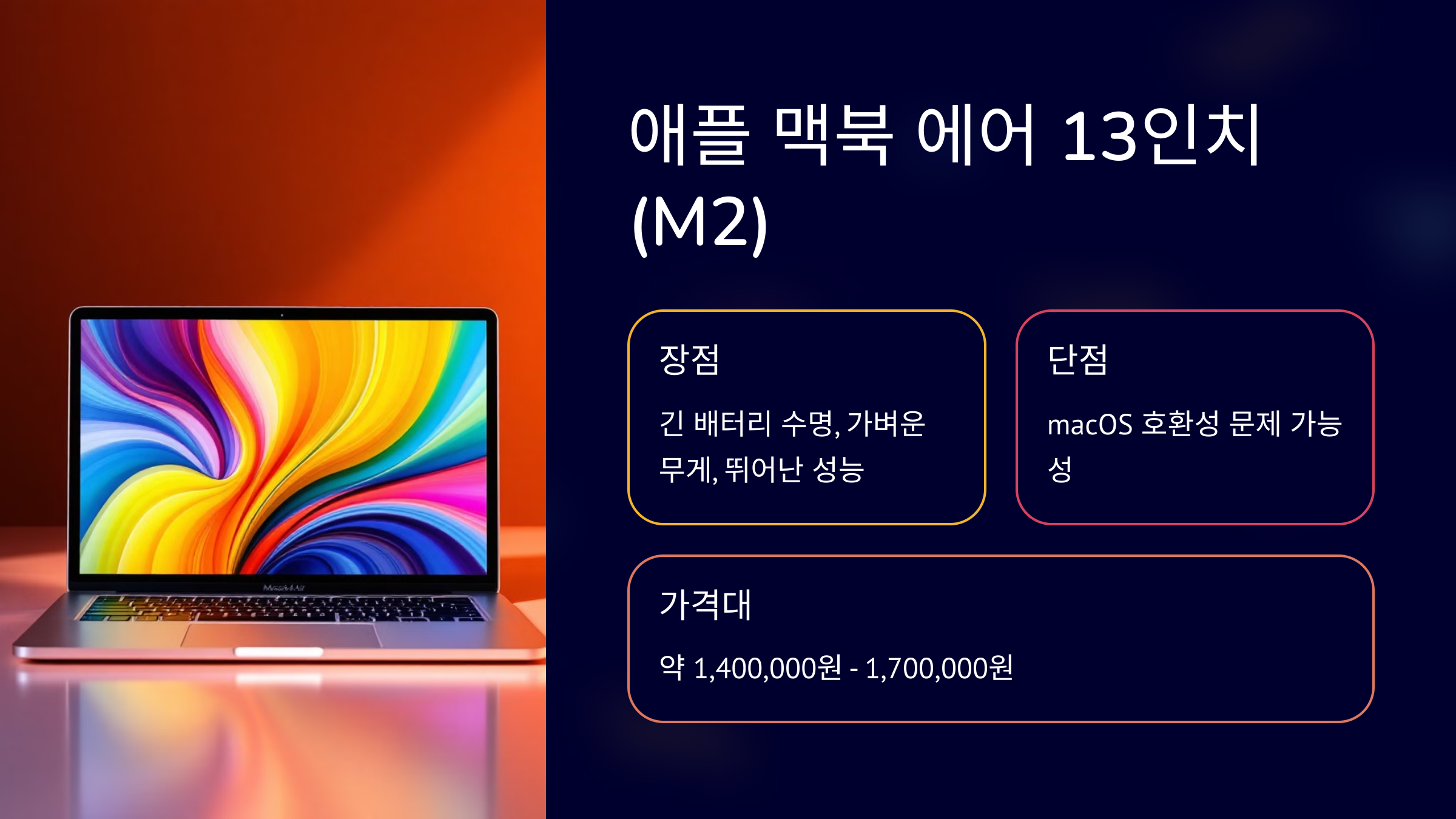 | 애플 맥북 에어 13인치 (M2) | 긴 배터리, 가벼운 무게 | macOS 호환성 제한 | 1,400,000원 - 1,700,000원 |
