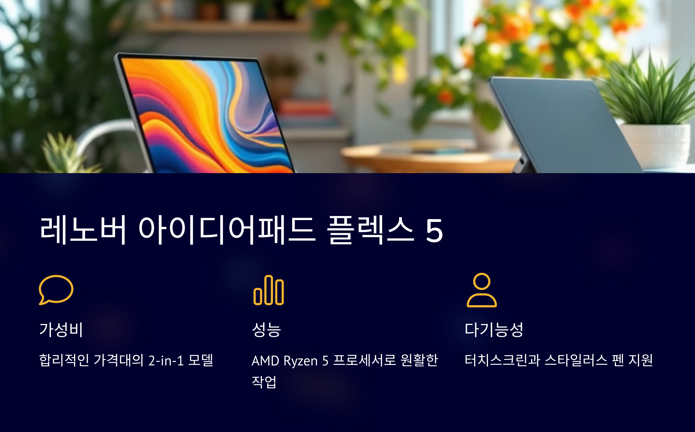 | 레노버 아이디어패드 플렉스 5 | 가성비, 터치스크린 | 고성능 작업에 제한적 | 900,000원 - 1,200,000원 |