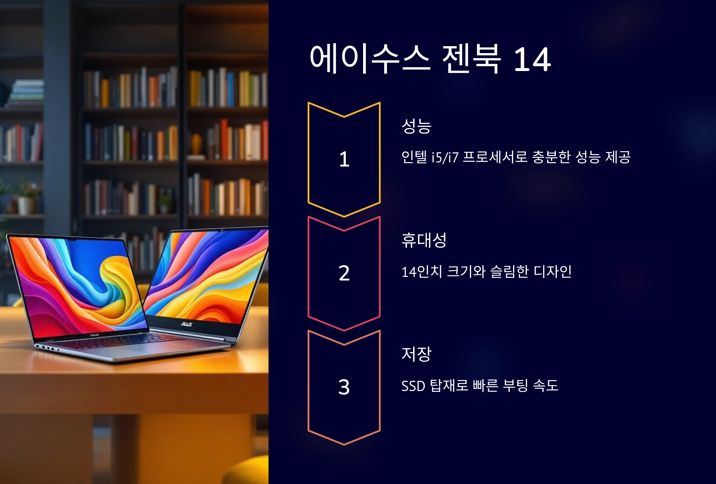 | 에이수스 젠북 14 | 휴대성, 빠른 SSD | 그래픽 작업 제한적 | 1,100,000원 - 1,500,000원 |