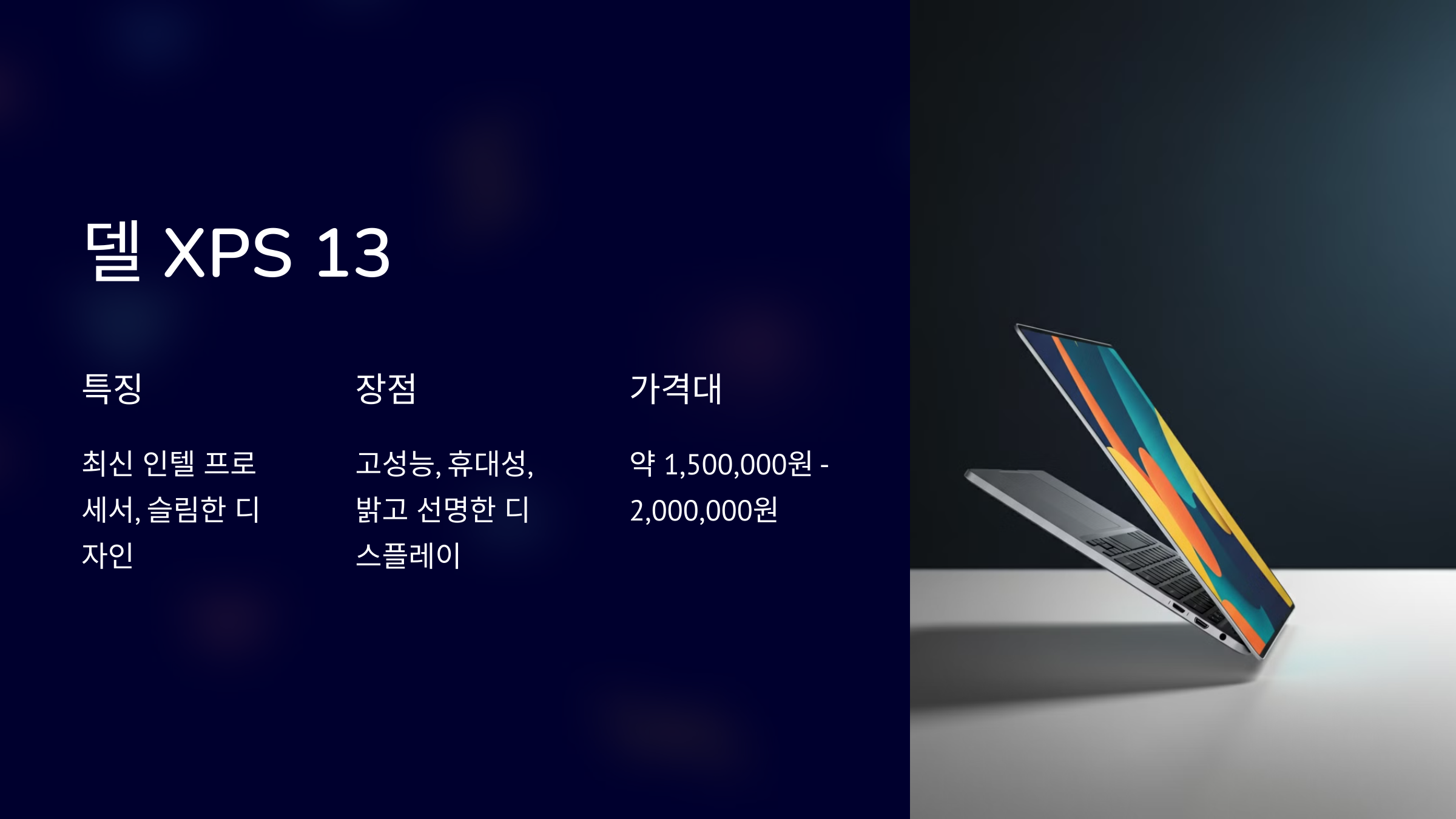 | 델 XPS 13 | 슬림한 디자인, 고성능 | 다소 높은 가격대 | 1,500,000원 - 2,000,000원 |