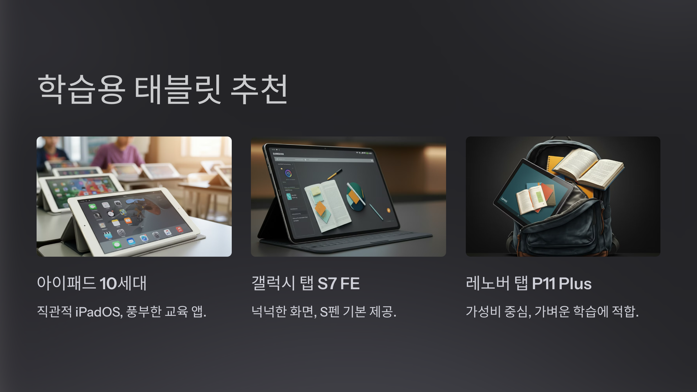 - 추천 이유: 저렴한 가격대에서 강의 시청 및 가벼운 학습 앱 사용에 적합합니다.