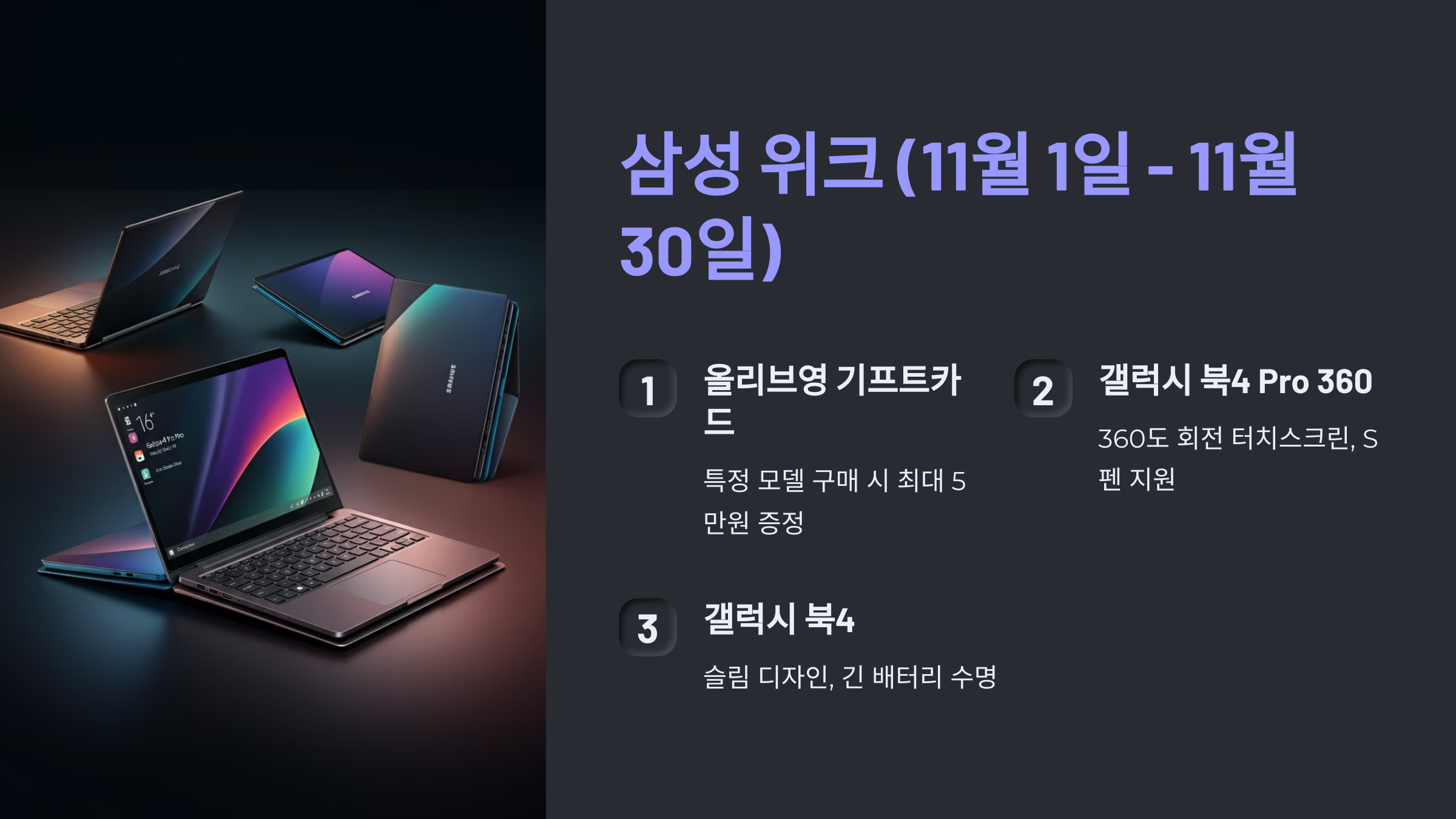 삼성전자는 11월 한 달간 'Samsung Week'를 통해 다양한 제품에 대한 할인과 프로모션을 진행합니다. 특히 삼성 노트북 구매 시 추가 혜택이 제공되어, 갤럭시 북 시리즈를 원하는 분들에게 매력적인 선택지가 될 수 있습니다.