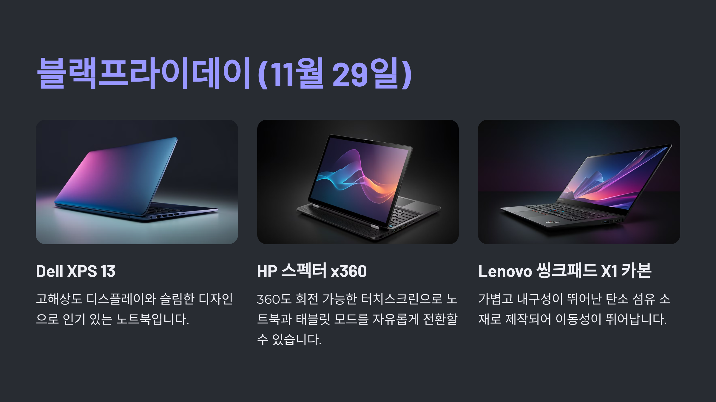 블랙프라이데이는 매년 11월 마지막 주 금요일에 열리는 대규모 할인 행사로, 전 세계의 다양한 브랜드 제품을 저렴하게 구매할 수 있는 기회입니다. Dell, HP, Lenovo 등 다양한 노트북 브랜드가 참여하여 여러 인기 모델에 대한 특별 할인이 기대됩니다.