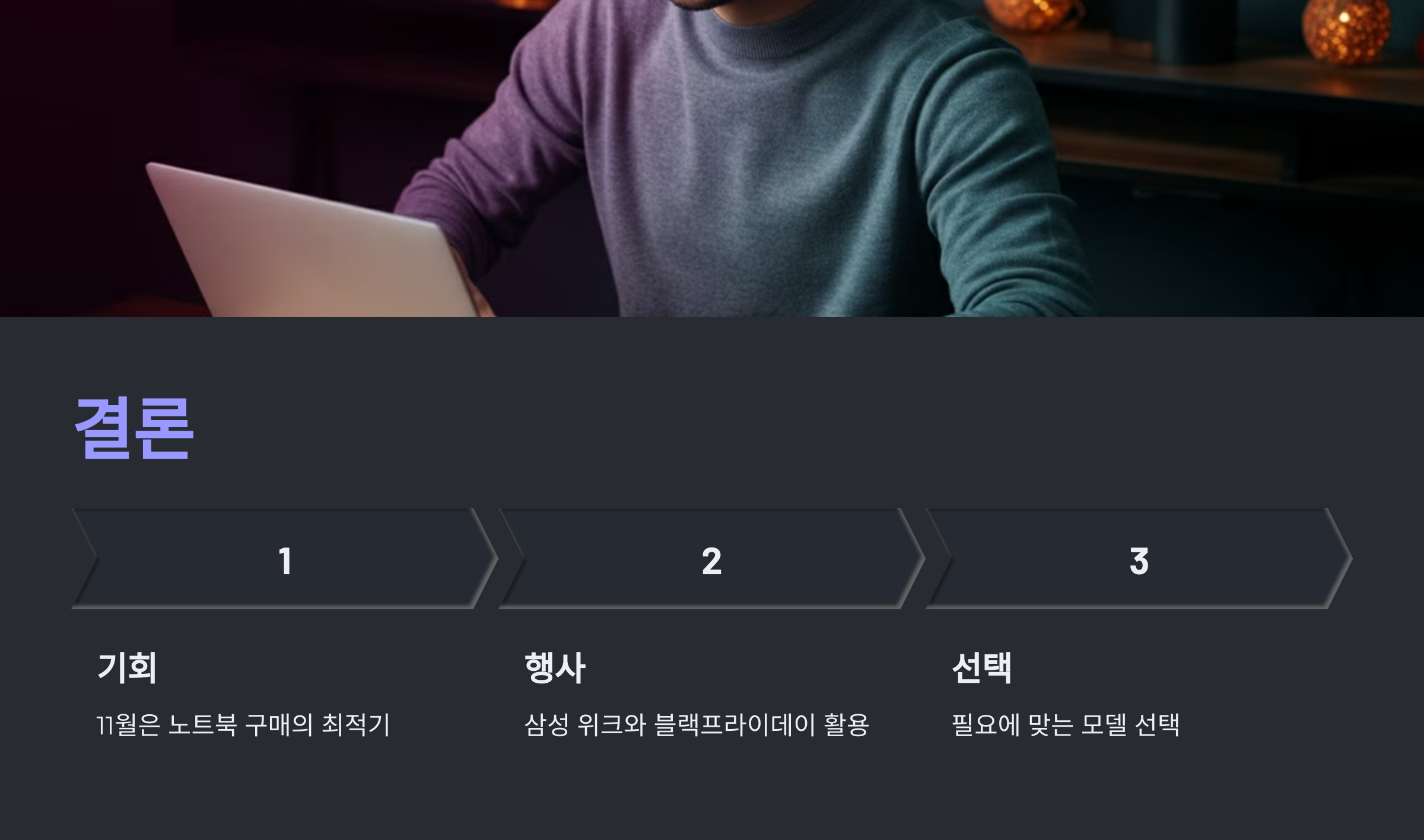 11월은 노트북 구매를 고려하는 소비자들에게 절호의 기회입니다. 삼성의 Samsung Week와 블랙프라이데이 기간 동안 원하는 노트북을 최적의 조건으로 구매할 수 있는 기회를 놓치지 마세요. 각 브랜드의 공식 웹사이트와 신뢰할 수 있는 판매처를 통해 최신 정보를 확인하고, 필요에 맞는 모델을 선택해보세요.
