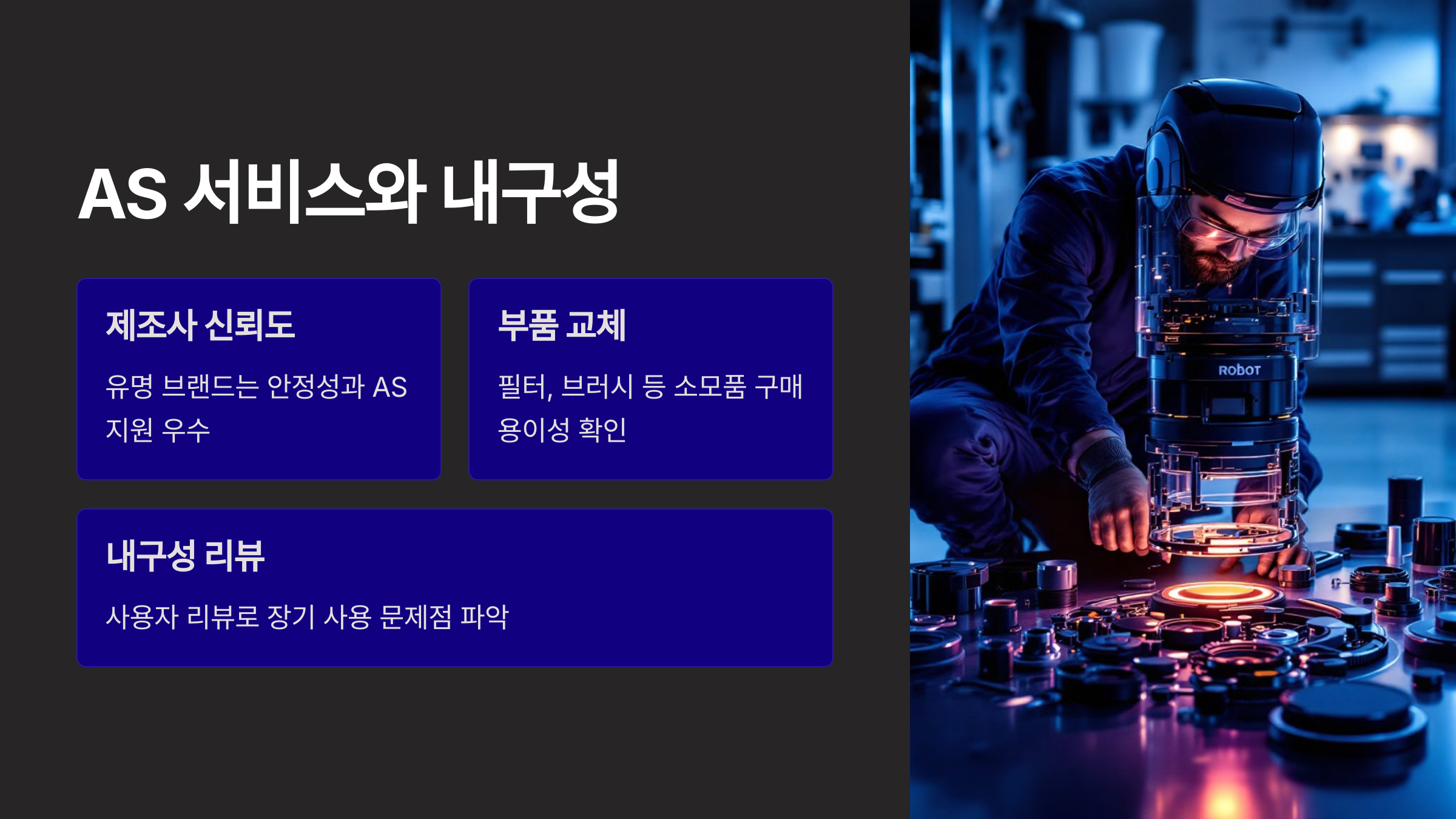 - 부품 교체 용이성: 필터, 브러시 등의 소모품을 쉽게 구할 수 있는지 확인하세요.