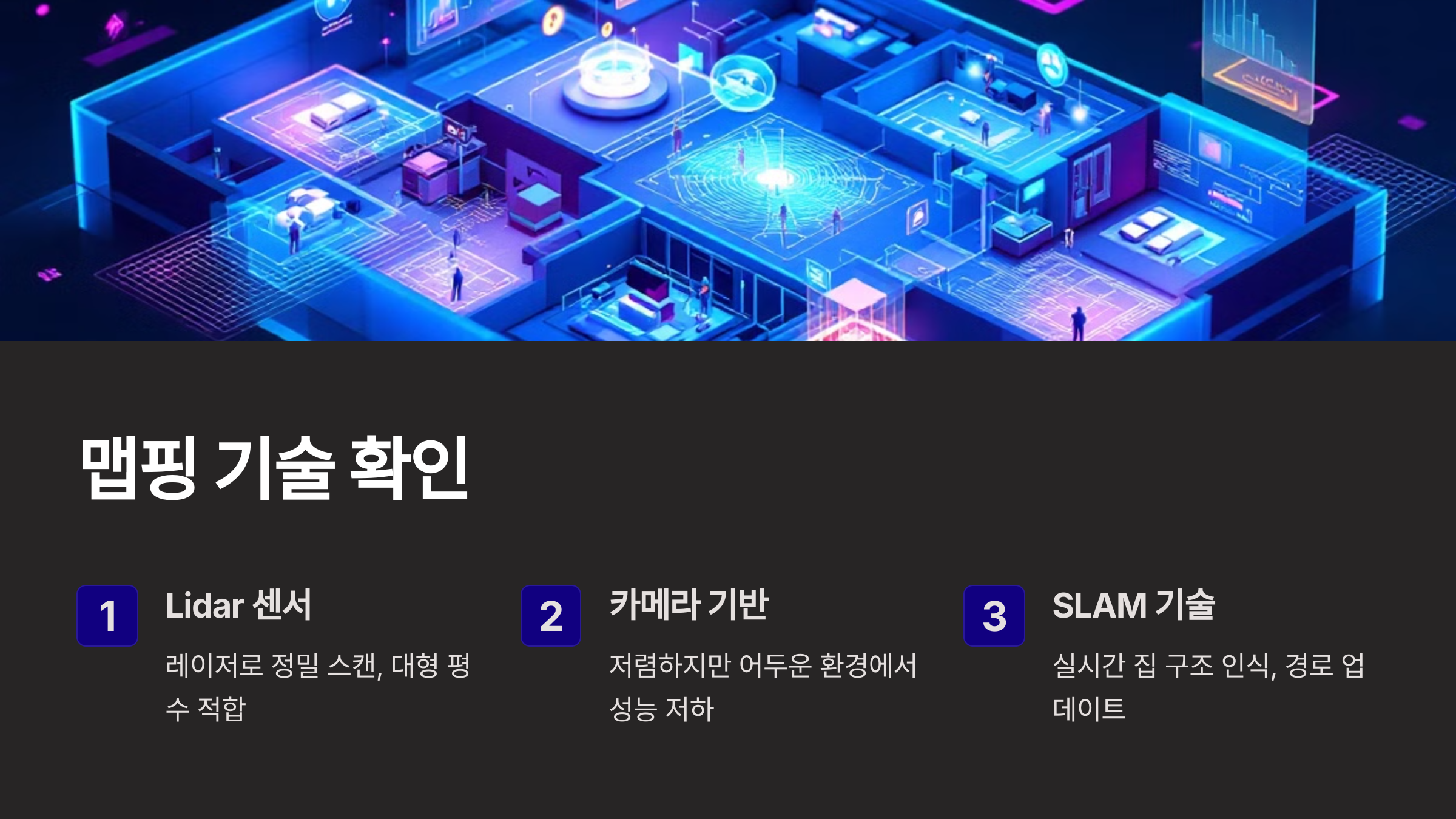 - SLAM 기술: 최신 AI 기술로, 실시간으로 집 구조를 인식하고 경로를 업데이트하는 기술입니다.