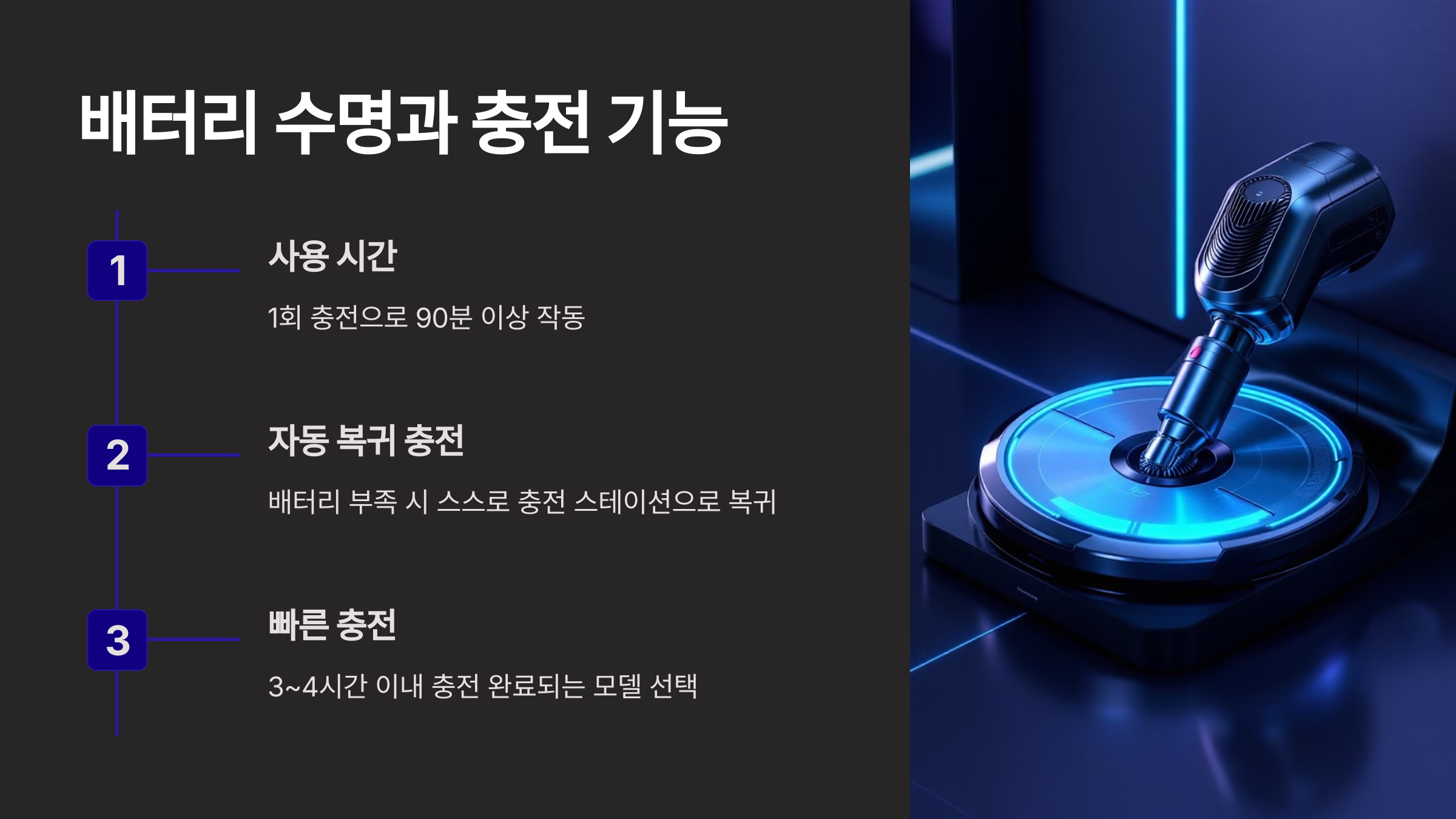 - 배터리 수명: 90분 이상, 자동 충전 기능 필수